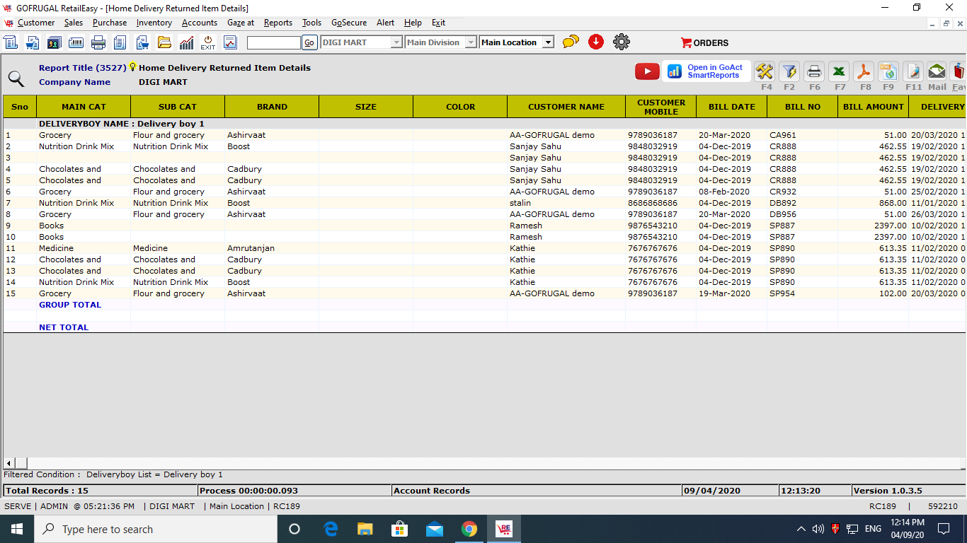 The reports' data can be grouped based on delivery boy,customer name etc for the specified time period
