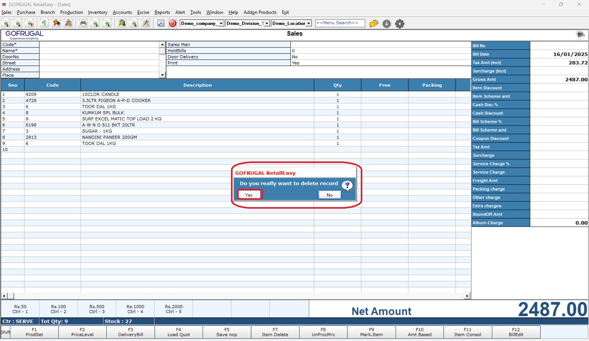 When the Item Delete function key is activated, the system prompts the user to confirm the deletion of the selected item. Once confirmed, the item is removed from the transaction, and the bill is updated accordingly.