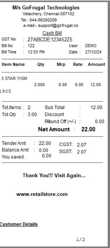 Duplicate Copies: If the customer requests an additional copy of the bill, the reprint function can be used without any extra manual effort.