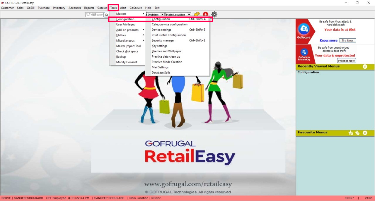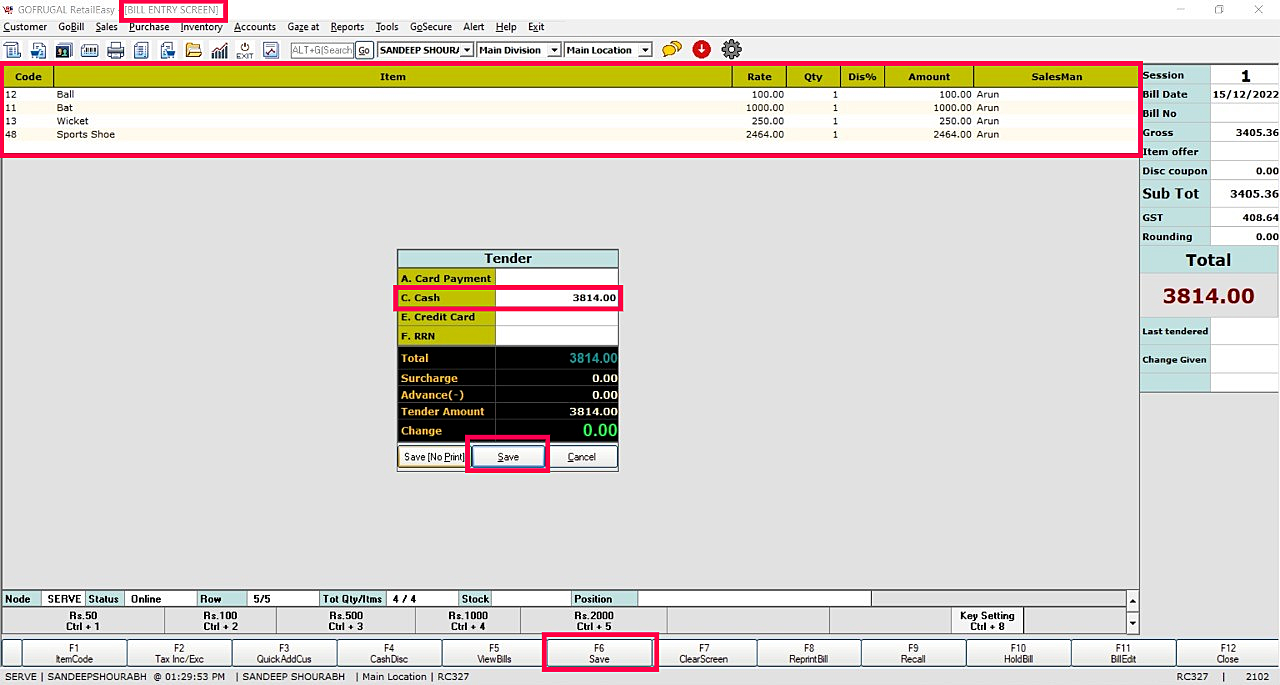 Step 2: Sales Bill Entry screen will appear. Press the key combination Ctrl+Shift+F12. Load items > Choose 'Save' function key > In Tender screen choose the payment mode as Cash > Select Save.