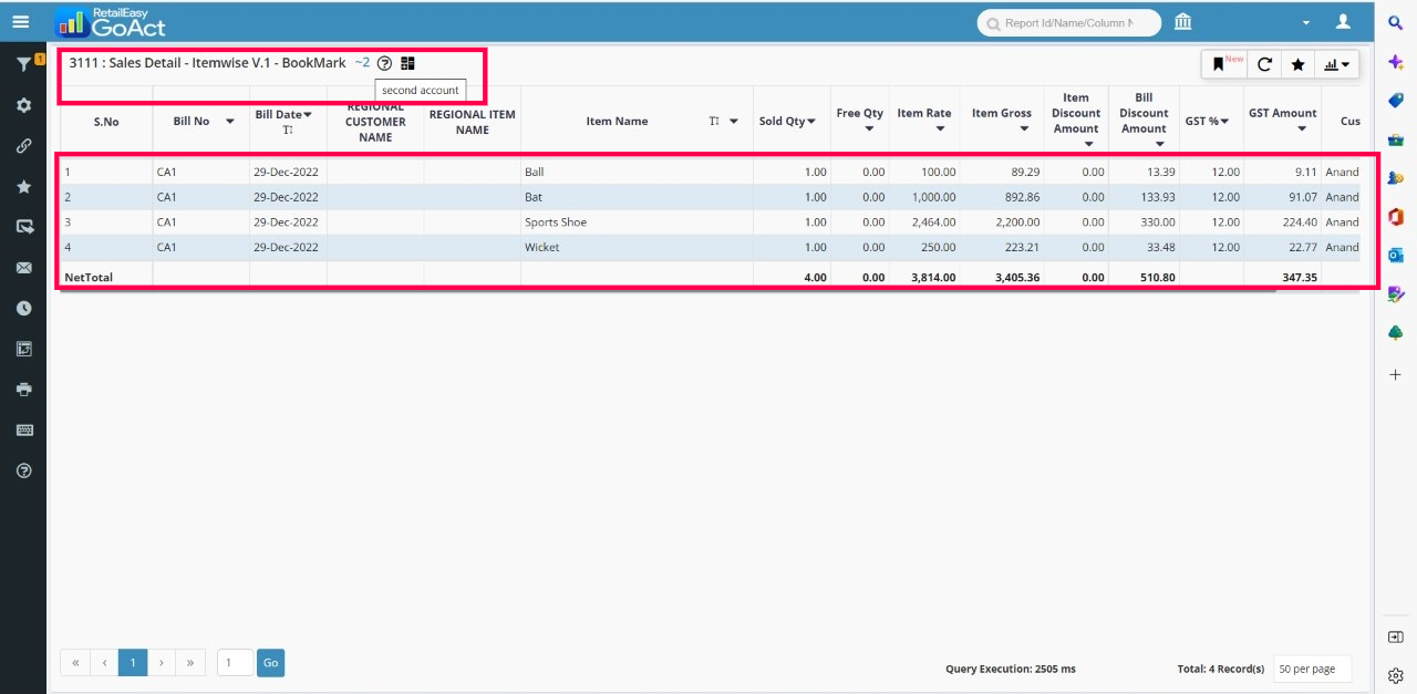 Step 2: Sales Detail - Itemwise screen will appear. Press the key combination Ctrl+Shift+2. The second book type entry will appear.