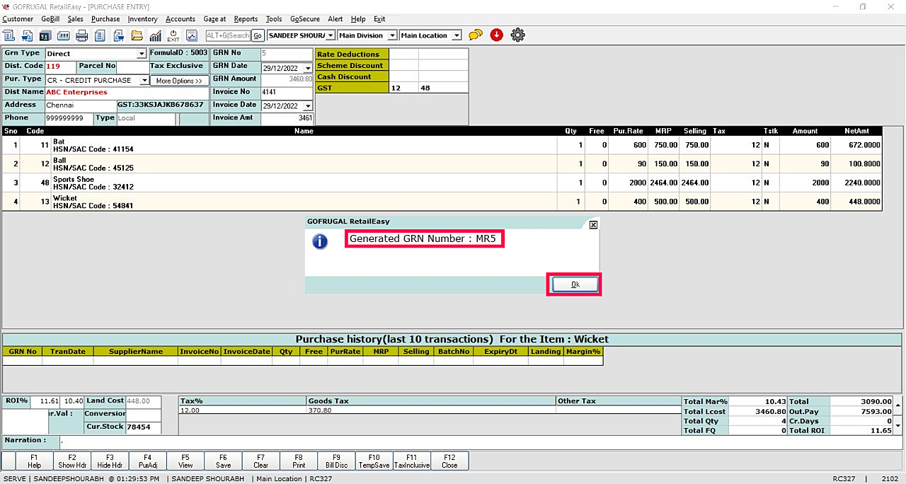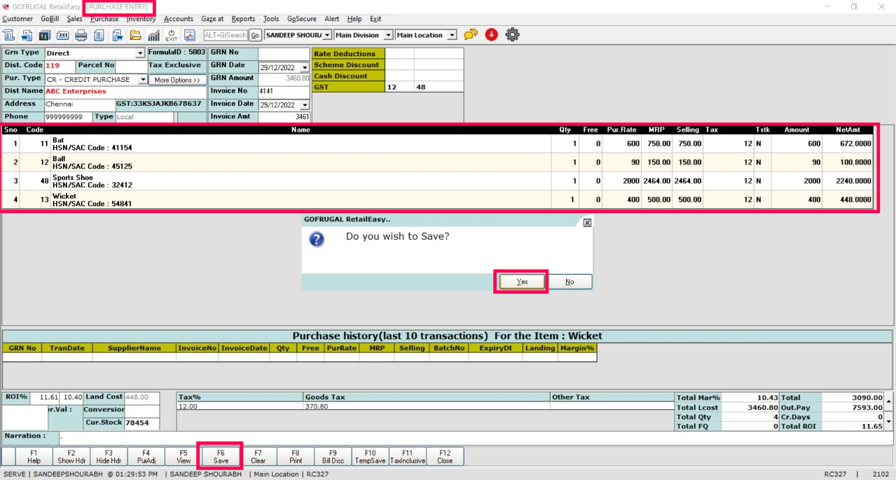 Step 2: Purchase Entry screen will appear. Press the key combination Ctrl+Shift+F12. Load items > Choose 'Save' function key > Select 'Yes' to save the Purchase Bill