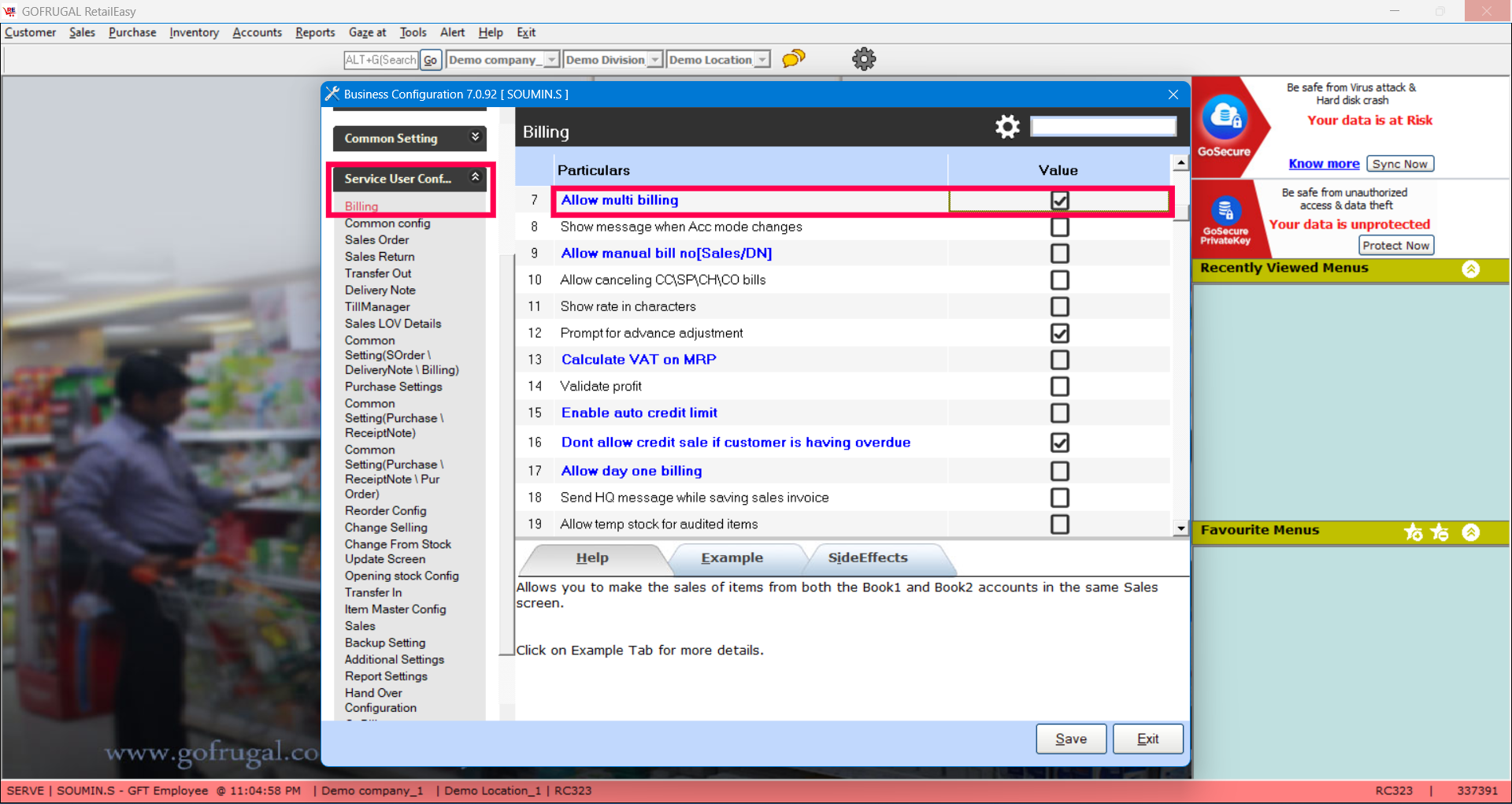 Go to Service User Configuration > Billing > Allow multi billing (Enable the checkbox)