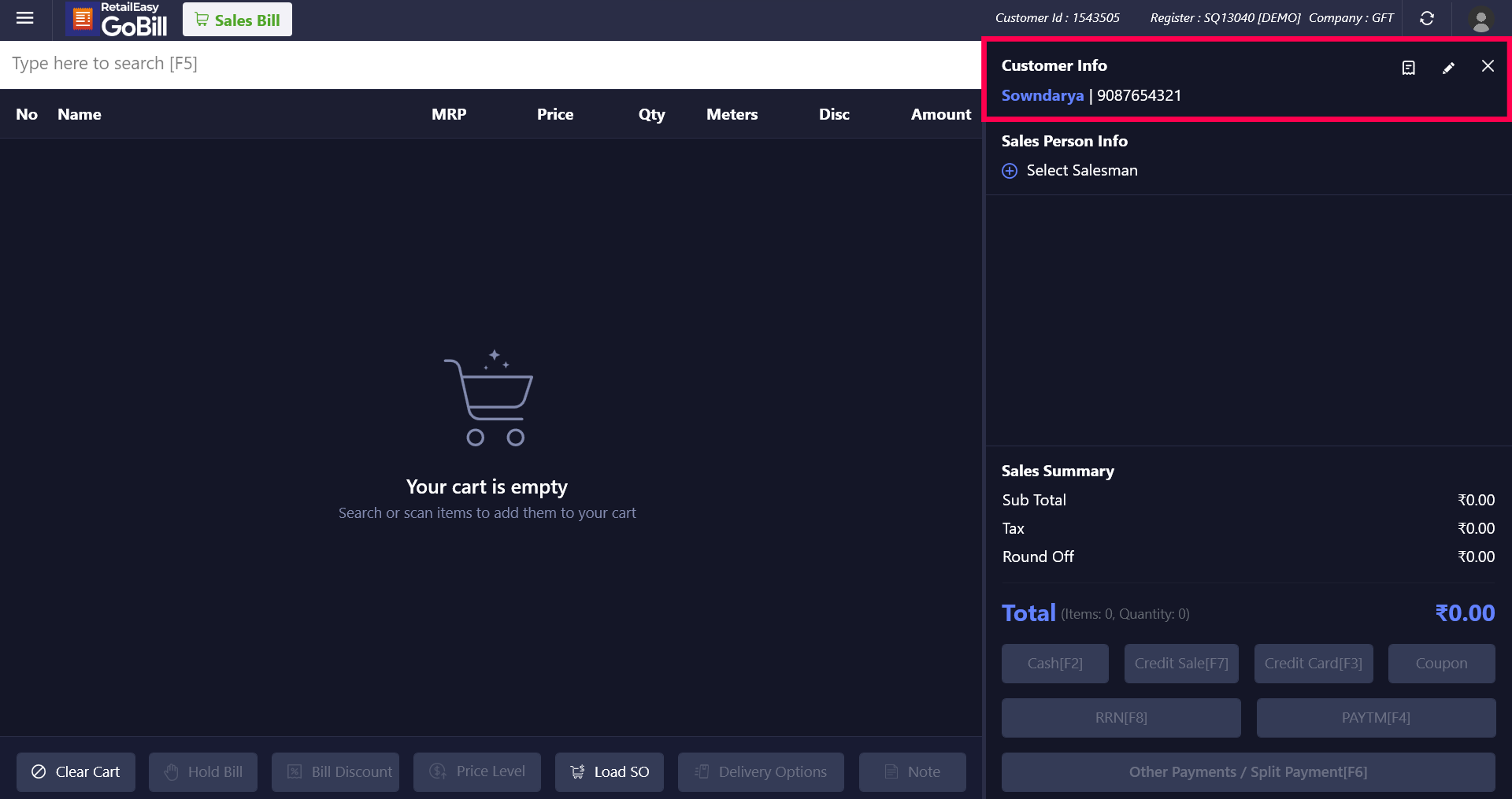 Step 2: To select/add the customer, enter the customer's name or mobile number into the search bar