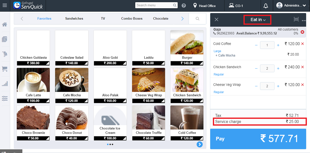 Step 7 :Go to Sales->Sales Bill, choose the order type and select the items. Based on order type service charge will be calculated on tender