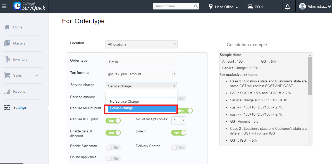 Step 6: Edit the location and choose the service charge based on order type and click on update.