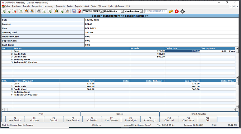 10. Once this is done the manager can login to POS and select the session of the delivery boy and view Actuals against each Payment type and the collection made by the delivery boy against the cash tender, if there are any discrepancy then it will be shown in the Discrepency column, the manager can close the session by clicking on the 'Close Session button'.