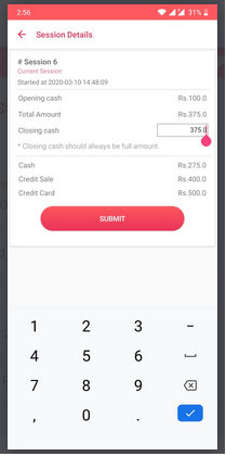 9. To enter the collection cash amount, select the session and enter the 'closing cash' and click on the 'submit'.