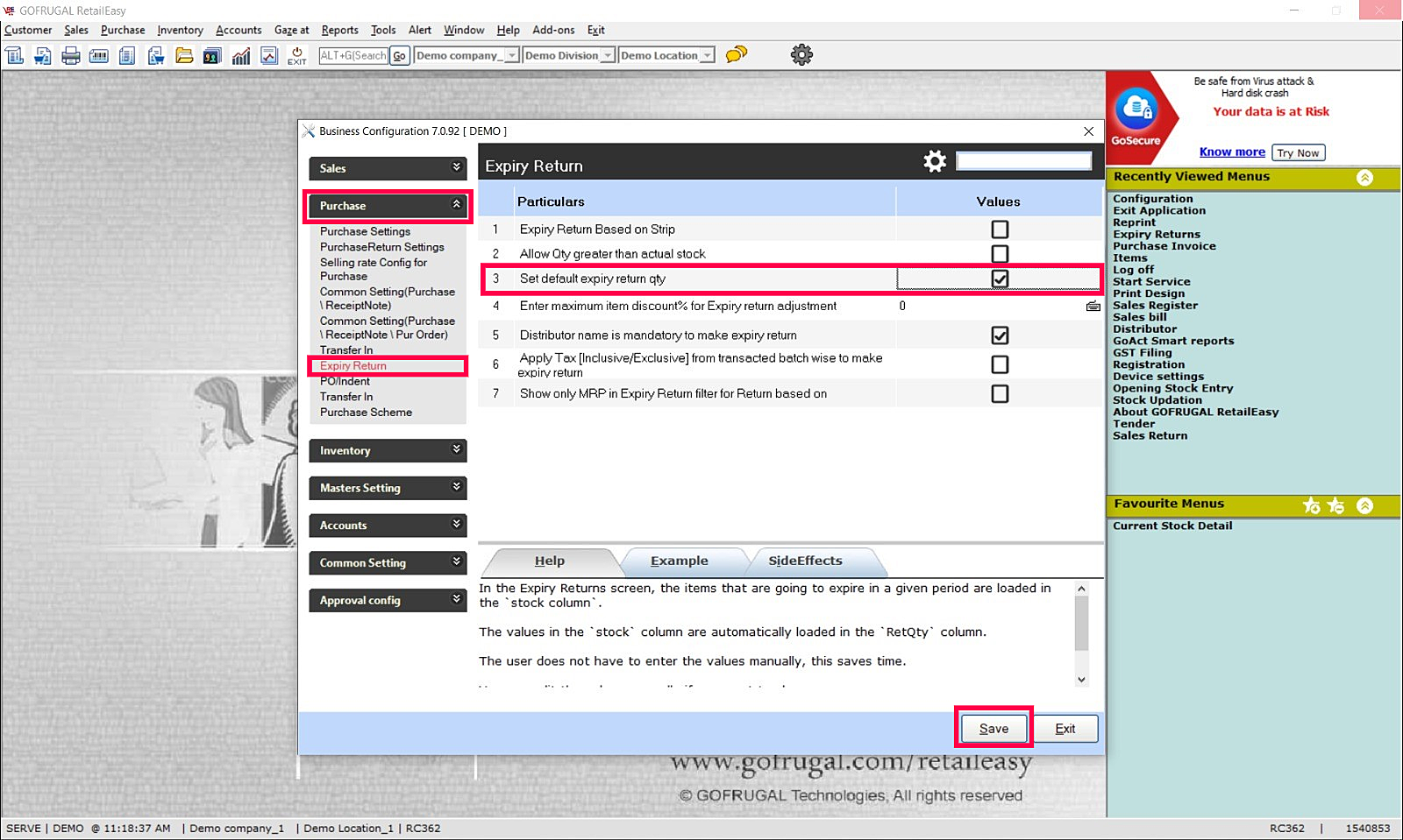 Step 2: Business Configuration screen will appear. Go to Purchase > Expiry Return - Set default expiry return qty (Enable the checkbox). Click Save.