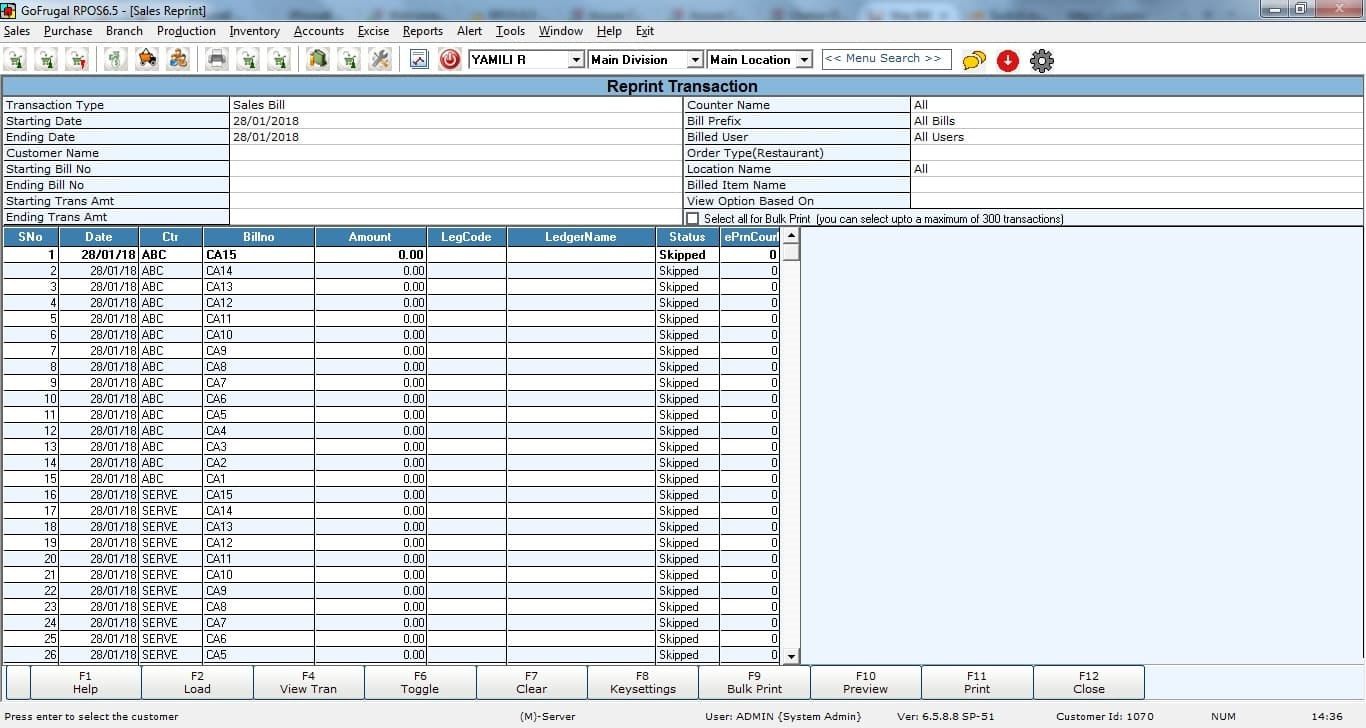 Select any skipped bill to enter the item details, customer, and payment details (tender).