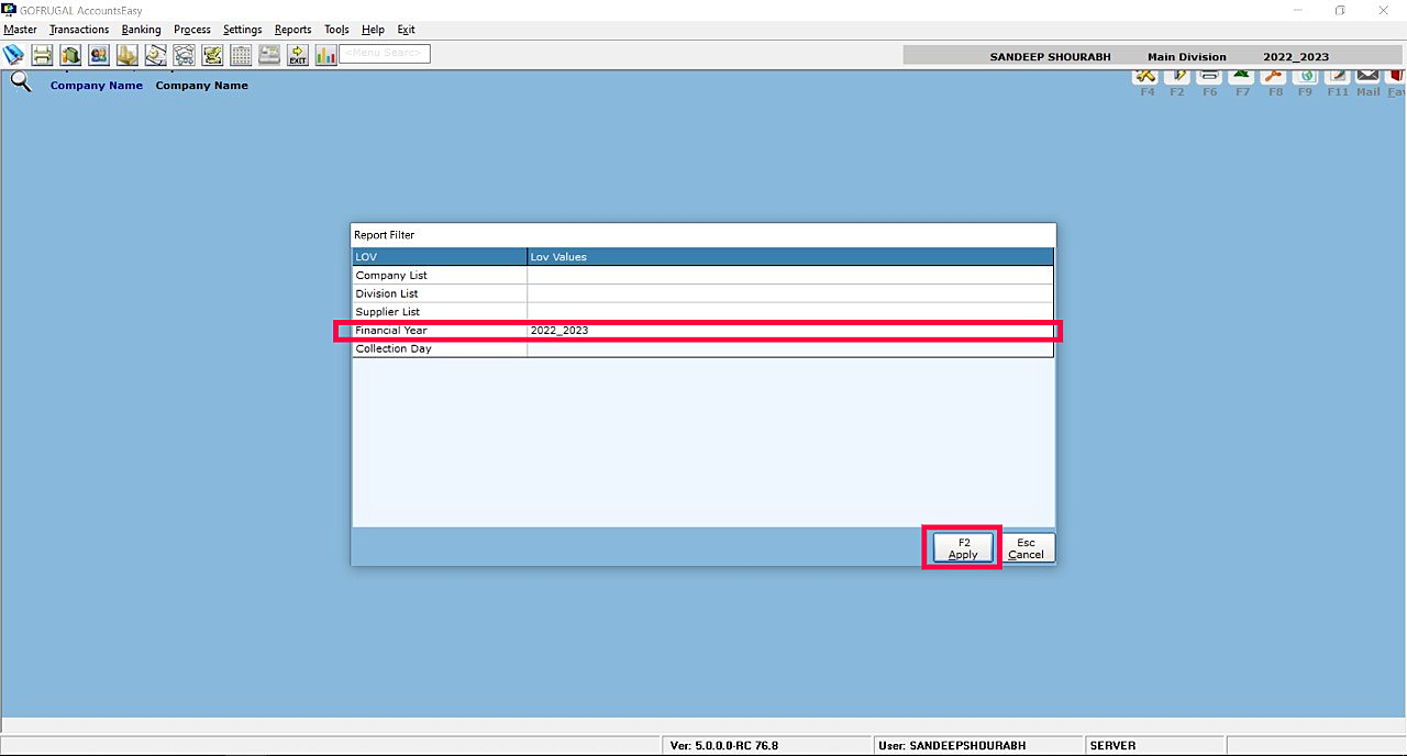 Step 4: Report Filter Screen will appear where need select the listed LOV and click Apply (F2).