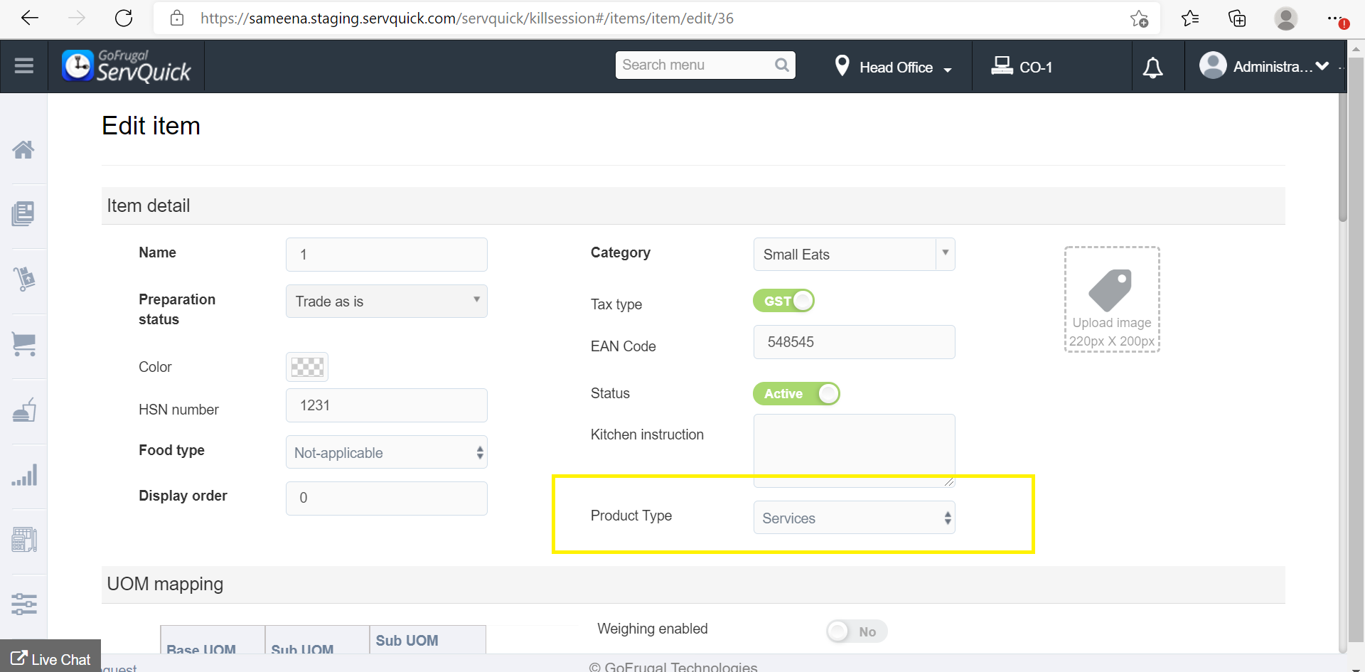 Steps 1:Go to Master->Menu->Item->Add item/Edit item->choose product type as "Goods/Service"