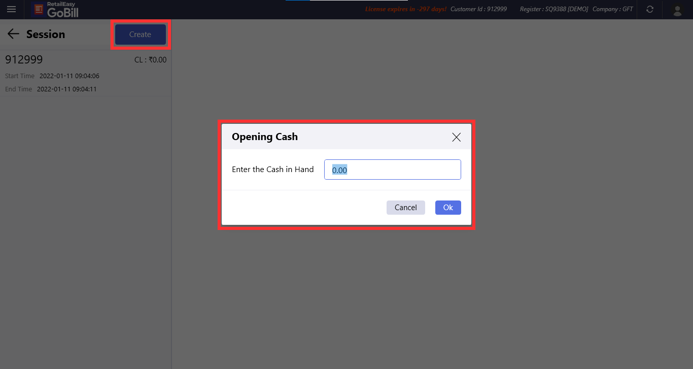 Step 4: At the day end to close the session, go to Session and click on the Close Session button and enter the Closing Cash.
