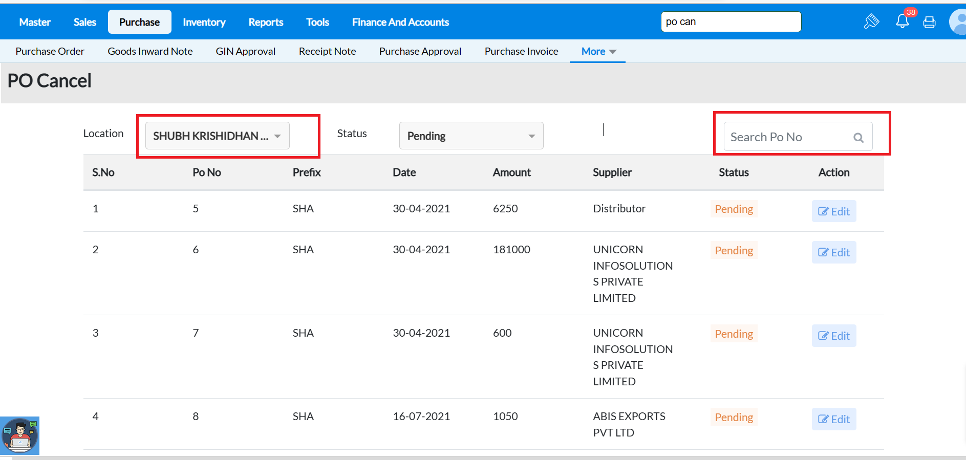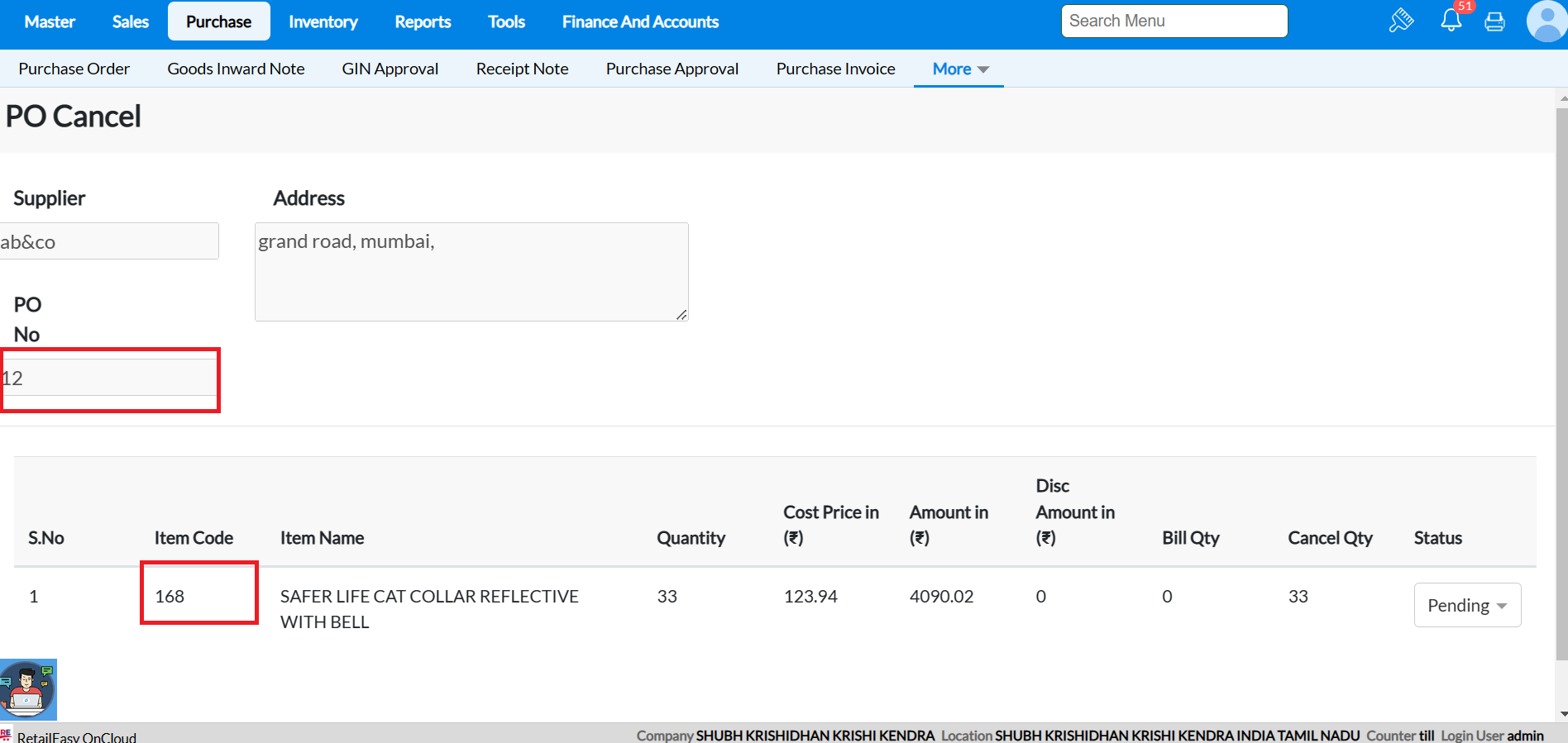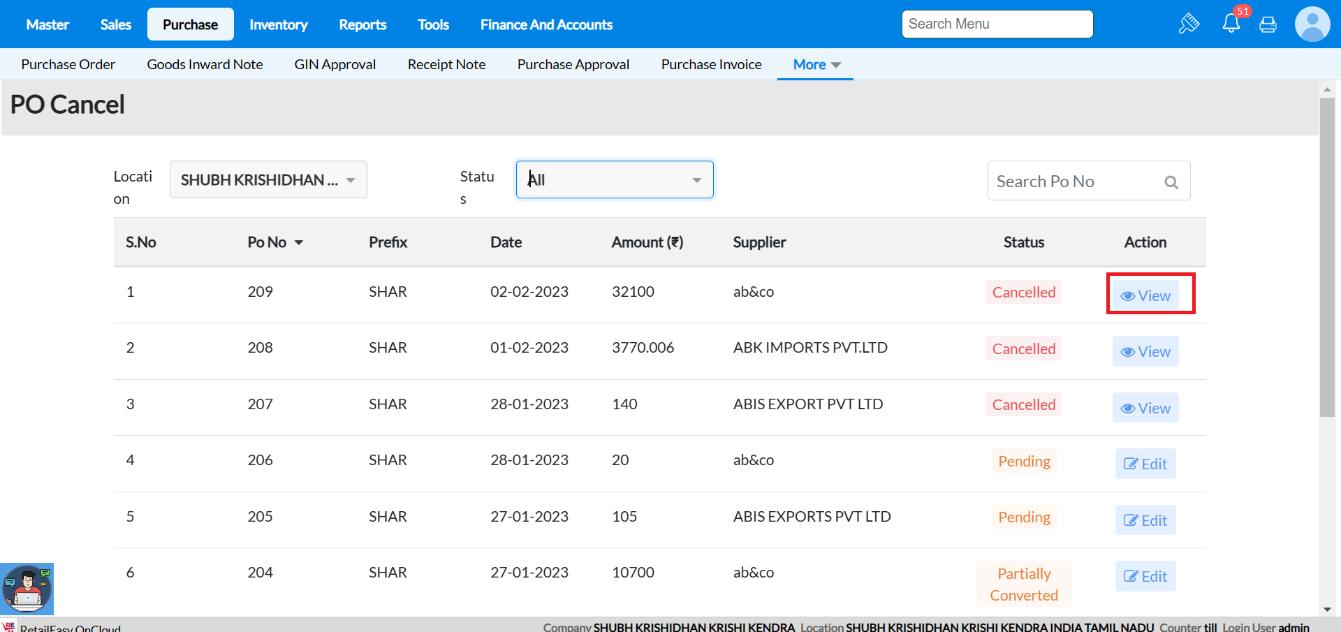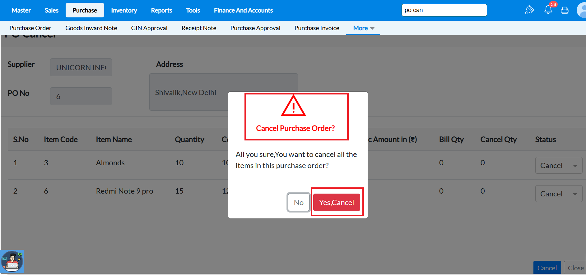 Menu Access: Go to Purchase ->More->PO Cancel