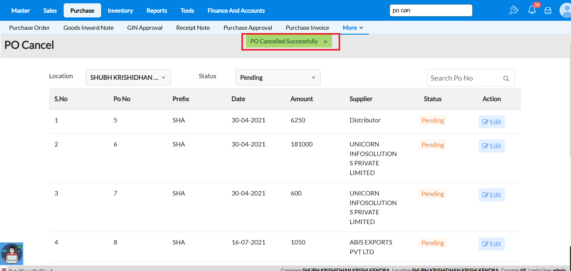 Step 5: Once Clicked on cancel ->We will get the pop up message of Po has been cancelled successfully.