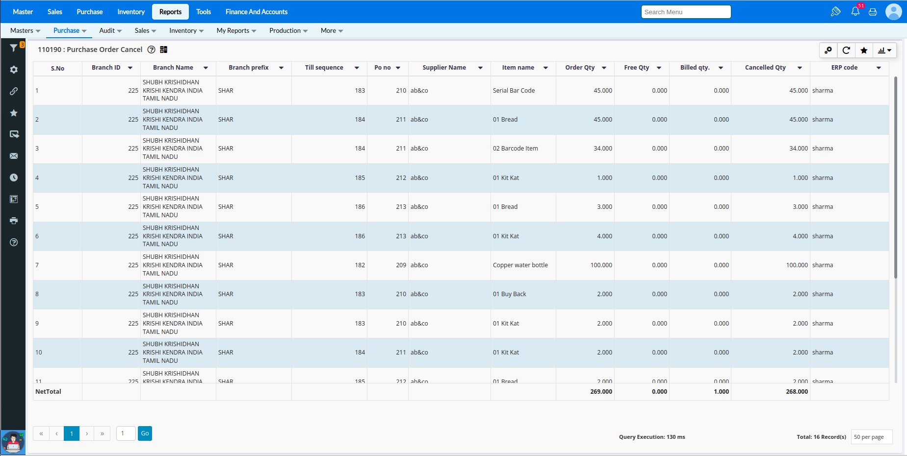 Step 8: Go to the Reports module to view the Purchase Order cancel reports Reports -> Purchase -> Pending/Canceled transaction.