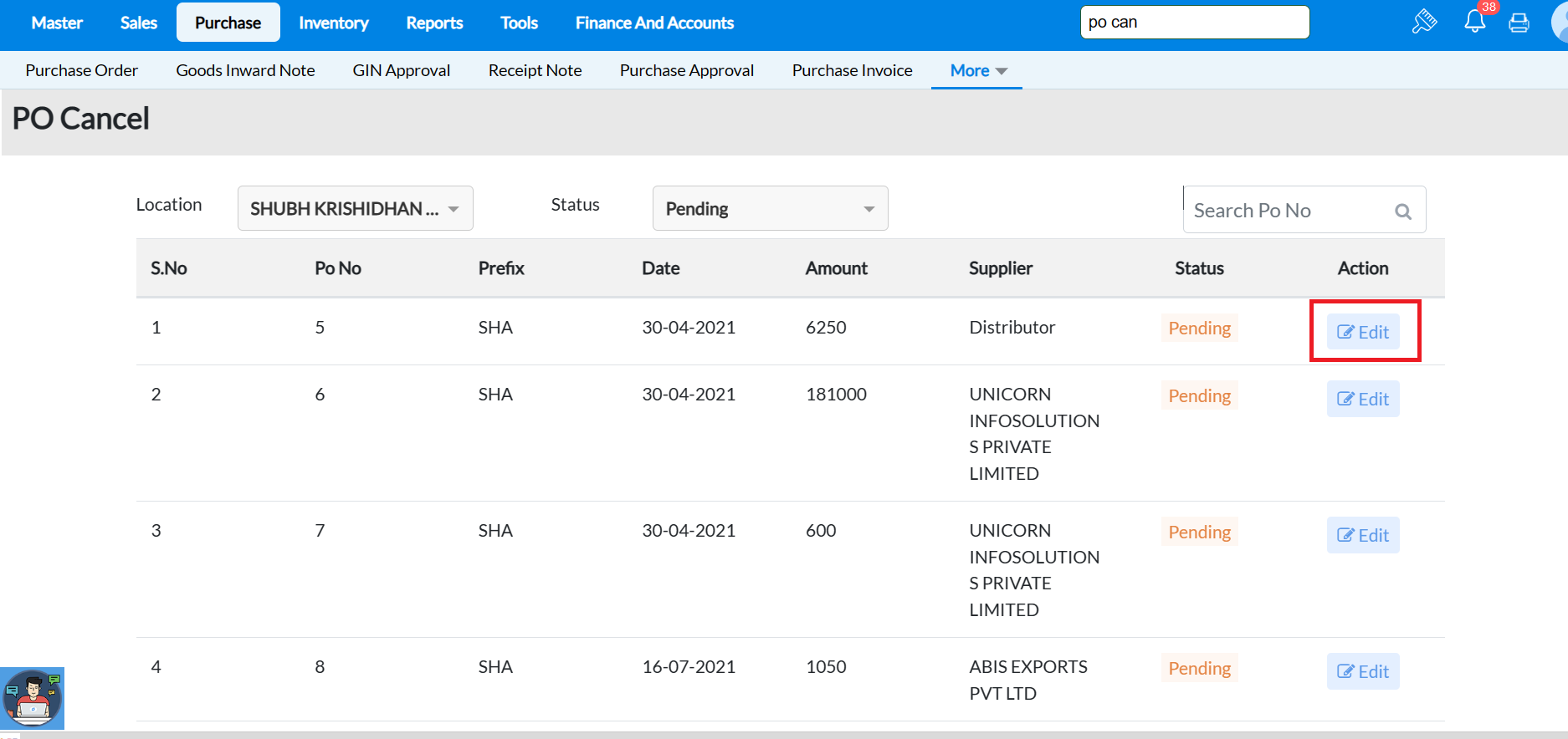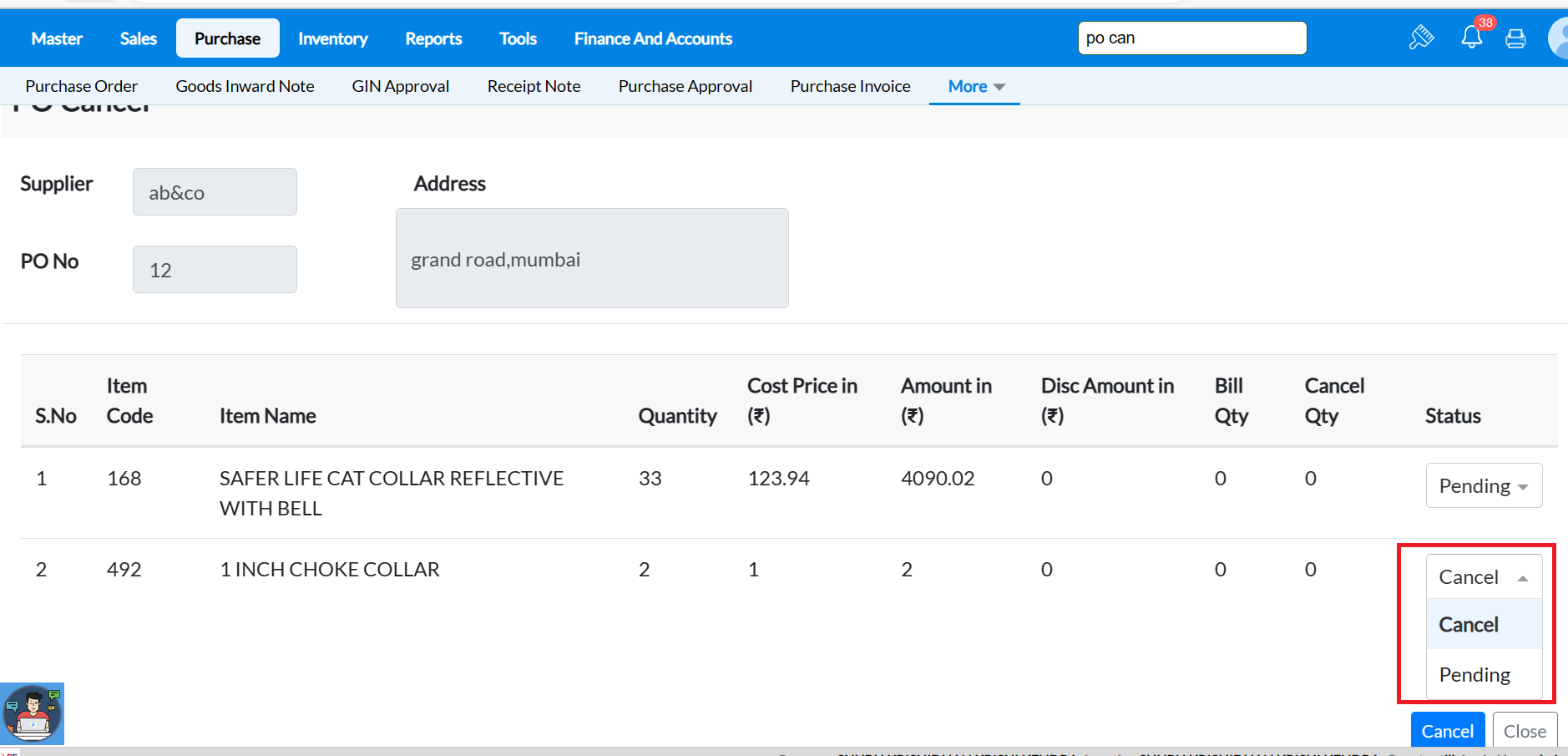Step 6: Click on status->choose "Cancel" against the item which need to cancelled in PO and cancel it.