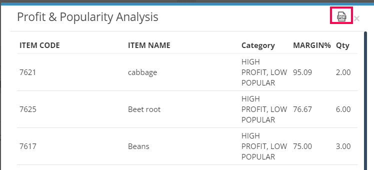 Additionally, you can see the underlying data marked by a red circle in the picture. Just click on it to explore the profit and popularity analysis. You can also export this data as a PDF.