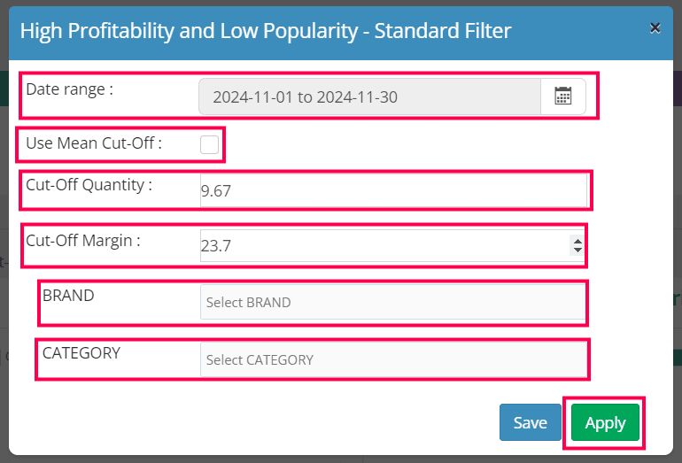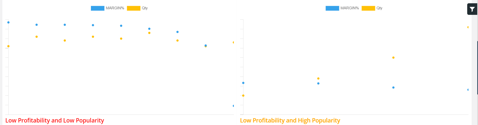 The way items are scattered is based on their respective margin and quantity, which can be higher or lower than the cut-off set by the user. Users can either specify a precise cut-off margin and quantity or select the mean cut-off option to work with average values.