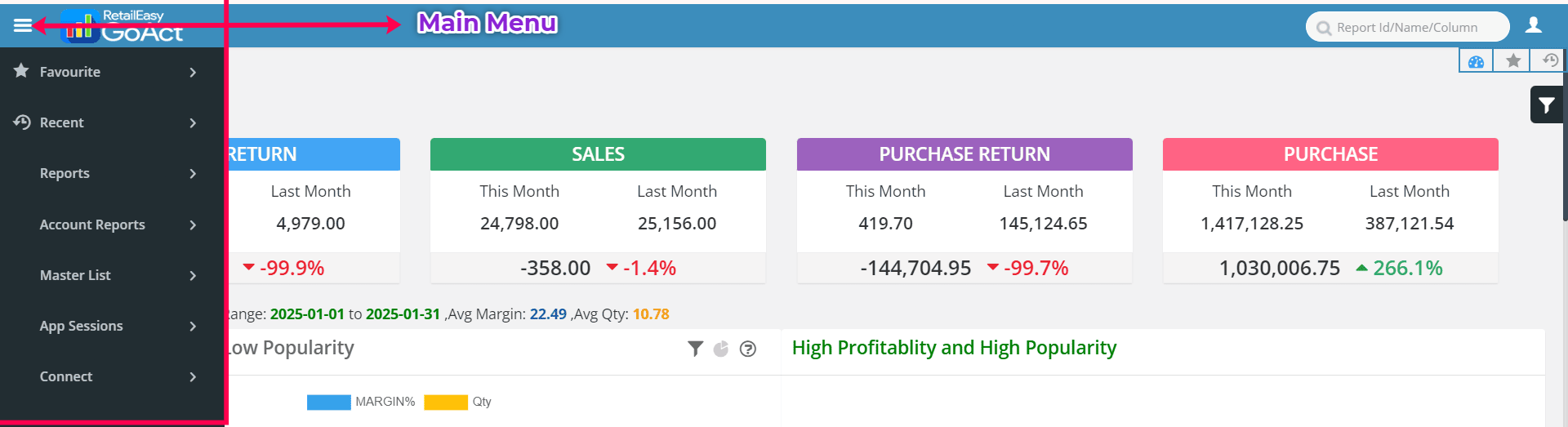 This help document explains the Main Menu in Smartreports. From here, you can quickly access POS Reports, Account Reports, Master Lists, App Sessions, and more. It also guides you on how to navigate these options easily.