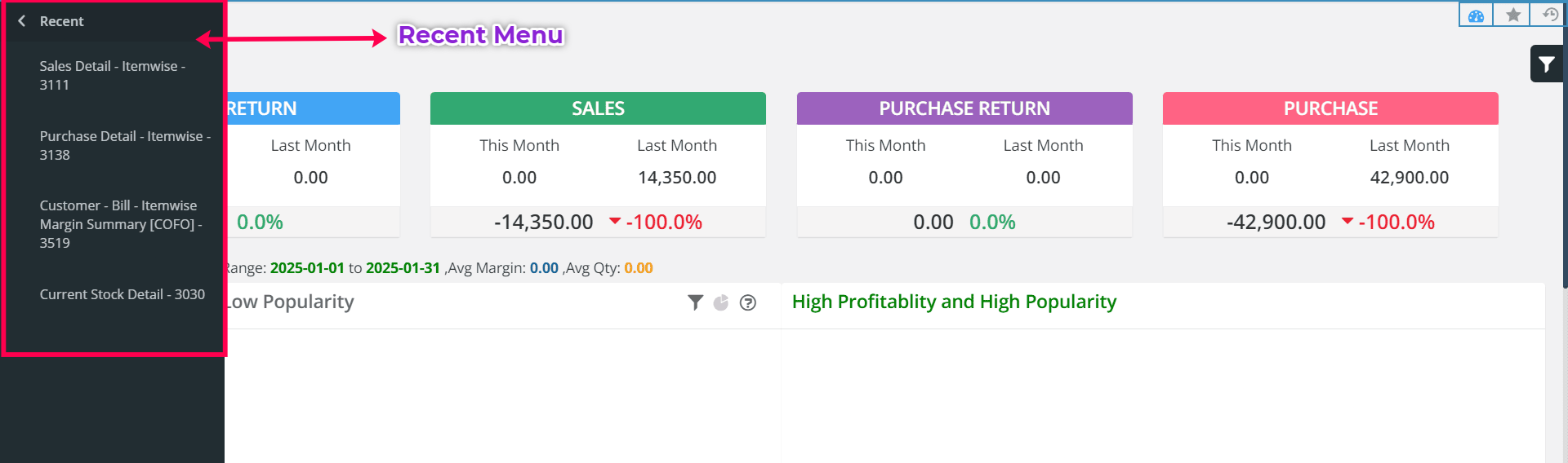 Recent Menu: Any report you open from the Main Menu will automatically be listed under the Recents tab for quick access.