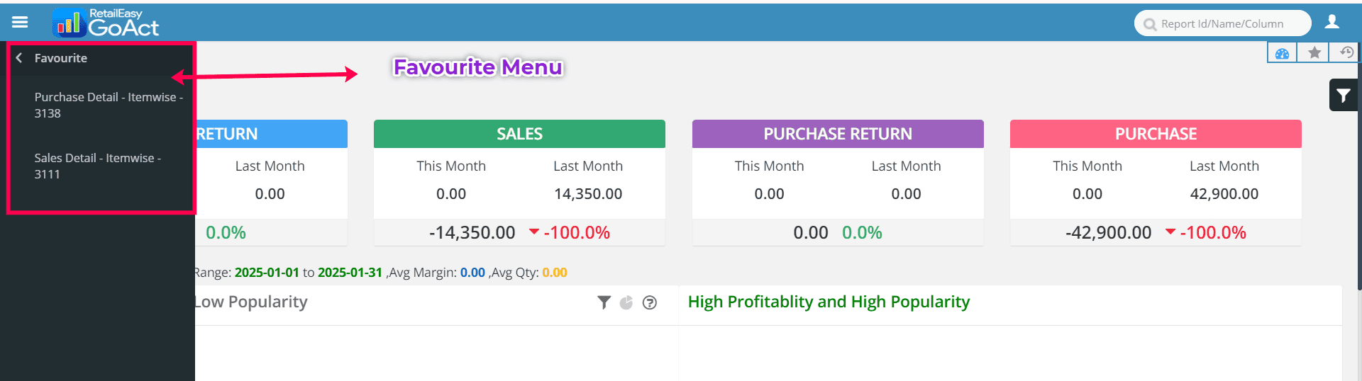 Favourite Menu: For every report, you’ll see a star icon. Click it to mark a report as a favourite. These saved items will appear under the Favourites tab.