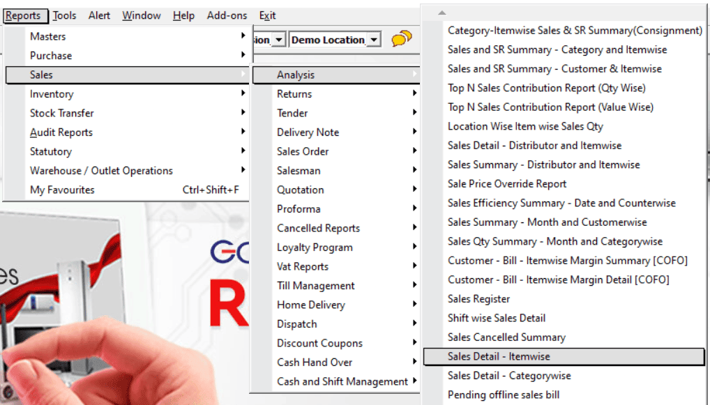 For Eg: Open the desired sales report in Gofrugal application by following this path: Reports → Sales → Analysis → Sales Detail → Itemwise