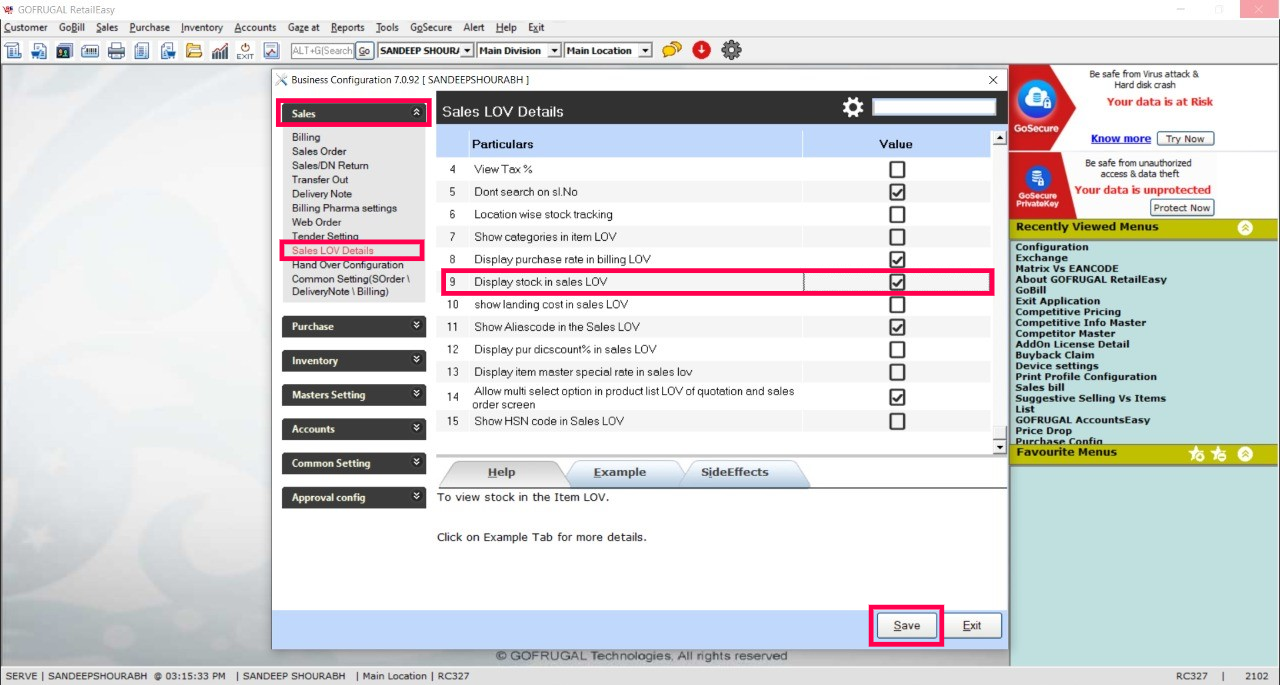 Step 2: Business Configuration screen will appear. Sales > Sales LOV Details - Display stock in sales LOV (Enable the checkbox) > Save.