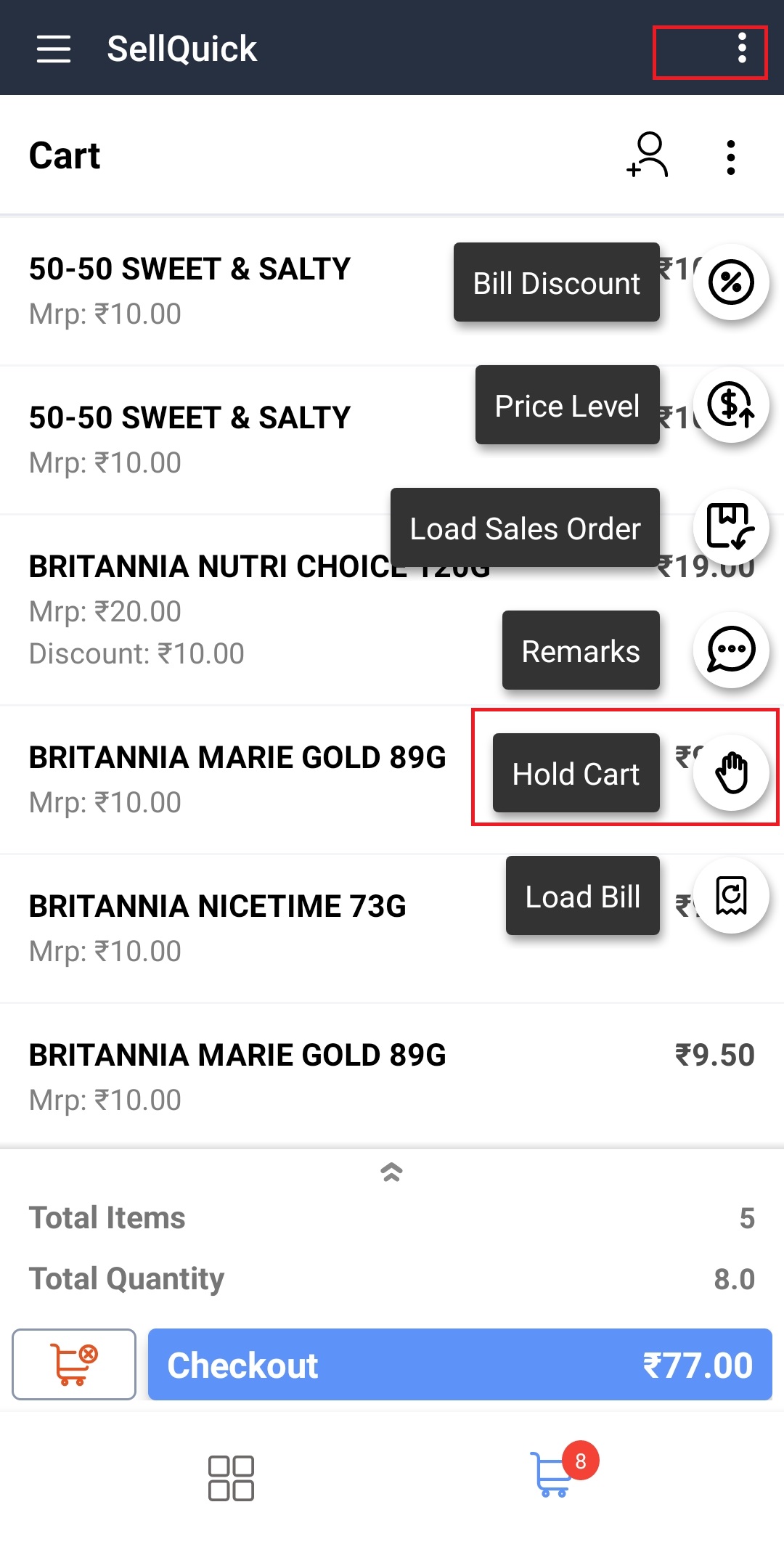 Step 1: Click on the three dots on the top right corner of the cart screen and click on Hold cart