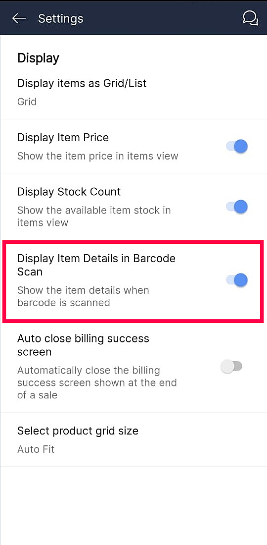 Step 3: Display screen will appear. Enable the option Display Item Details in Barcode Scan.