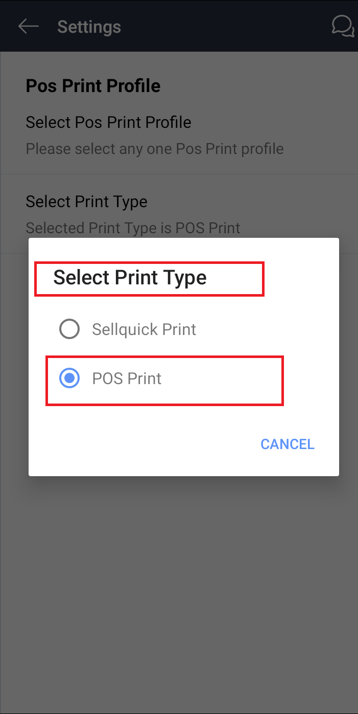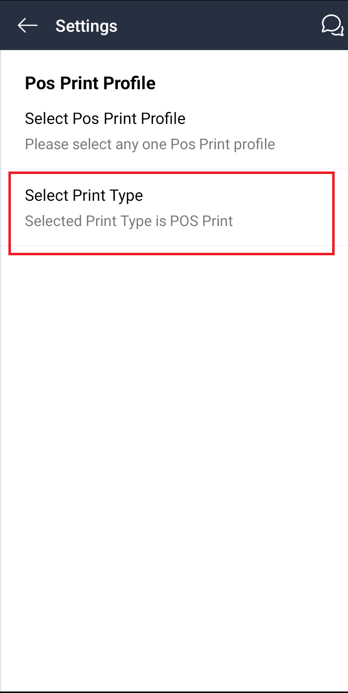 Click on settings->POS print profile->Select Print type->Enable "POS Print"