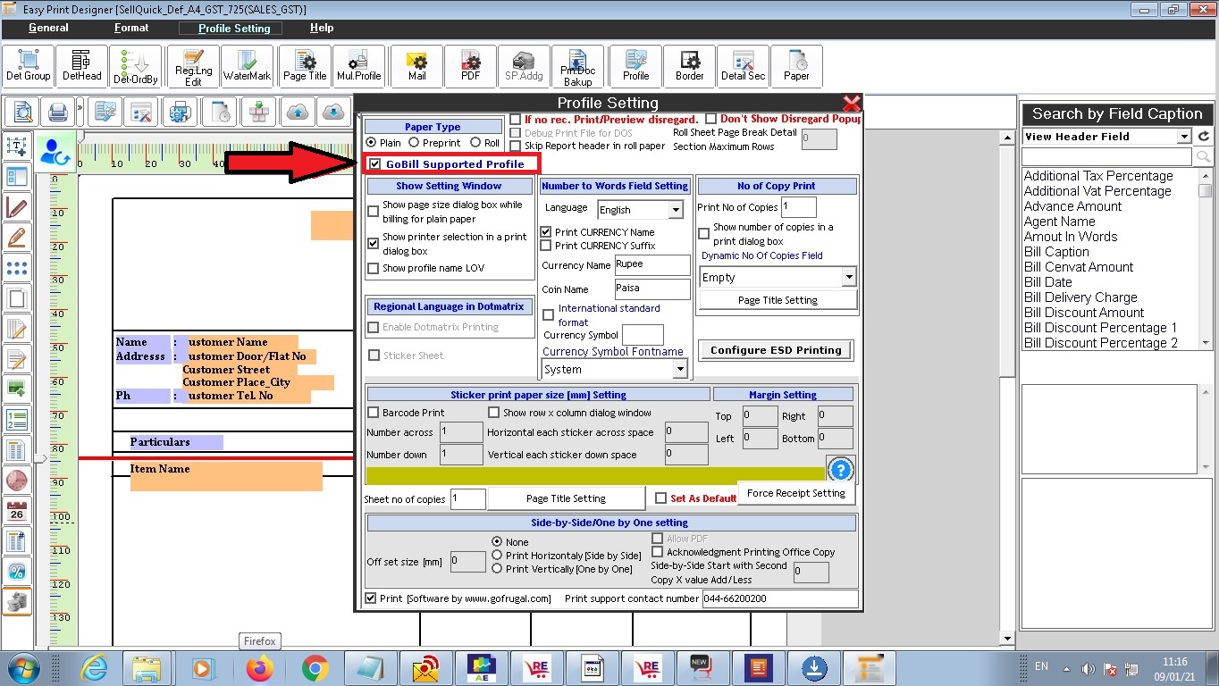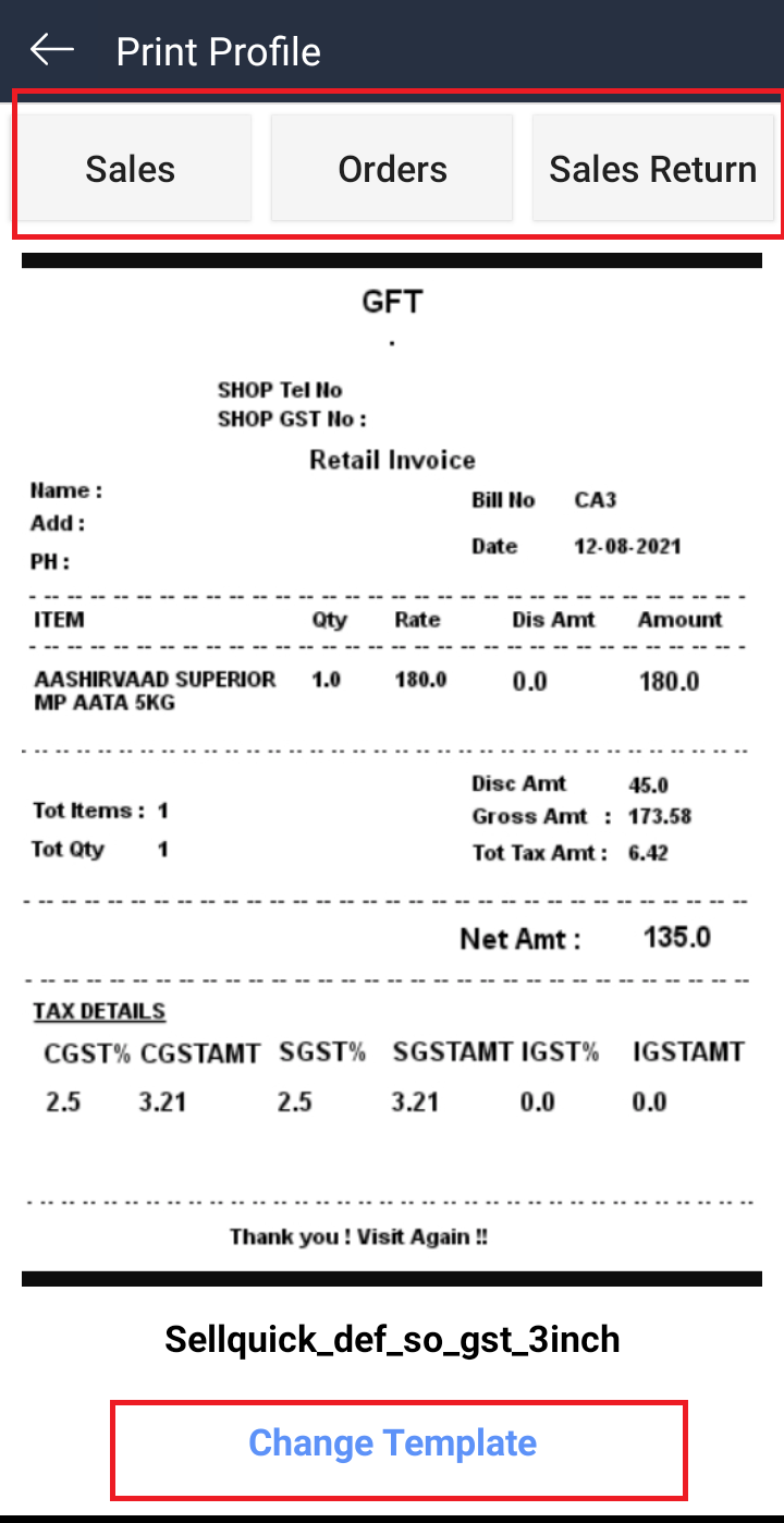 Note: Only GoBill Supported POS print profiles will be available in the change template screen.