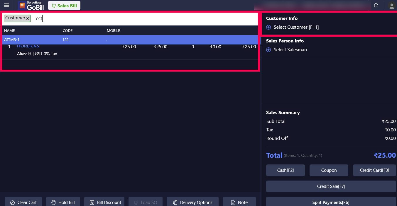 - If a bill discount is applied for the added customer, a pop-up can be seen on the top and you can check out the discounted bill amount in your cart as shown