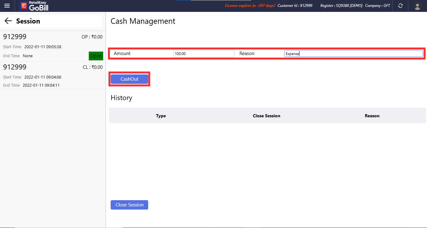 Step 3: If want to take the cash out for tea, snacks or other expenses click on Cash Out and enter the amount with a reason to have a track.