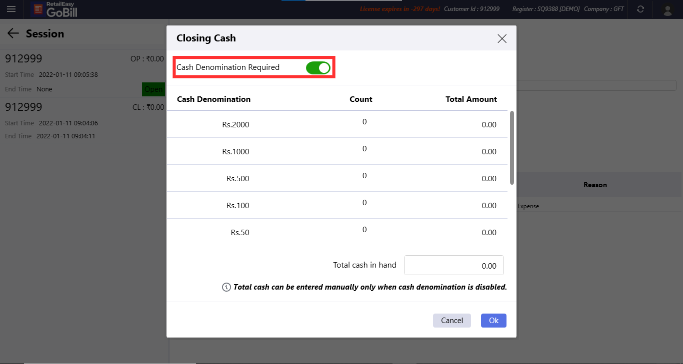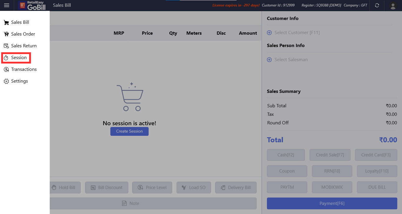Session Management is to manage user-wise cash inflow and outflow in the billing counters. It captures all transactions that result in direct cash flow to provide a detailed summary of each session.