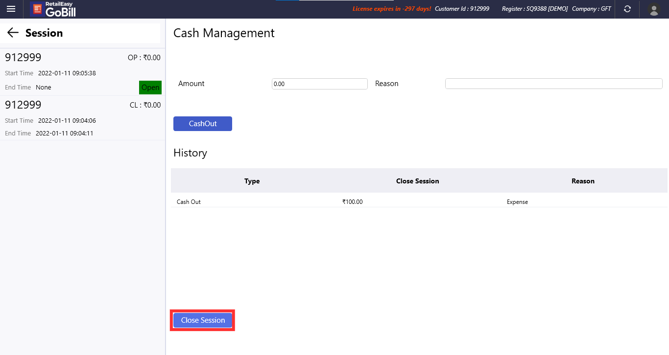 Step 4: At the day end to close the session, go to Session and click on the Close Session button and enter the Closing Cash.