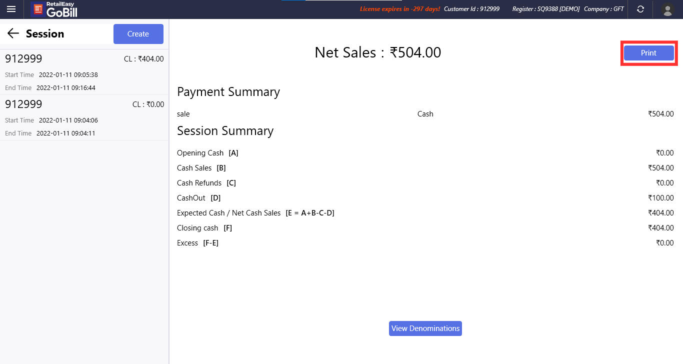 For Example, Cash sales, Cash Out, Cash refund, Closing cash, Shortage are captured and will be shown in the session summary.