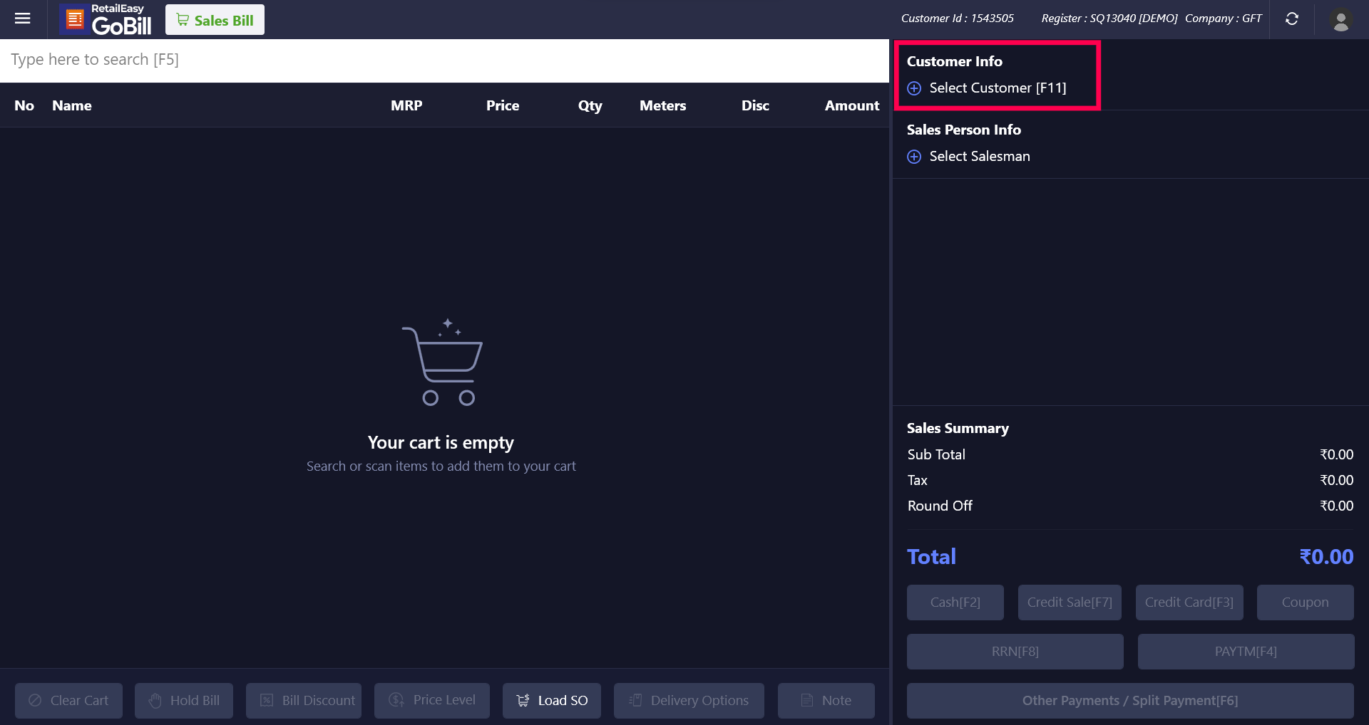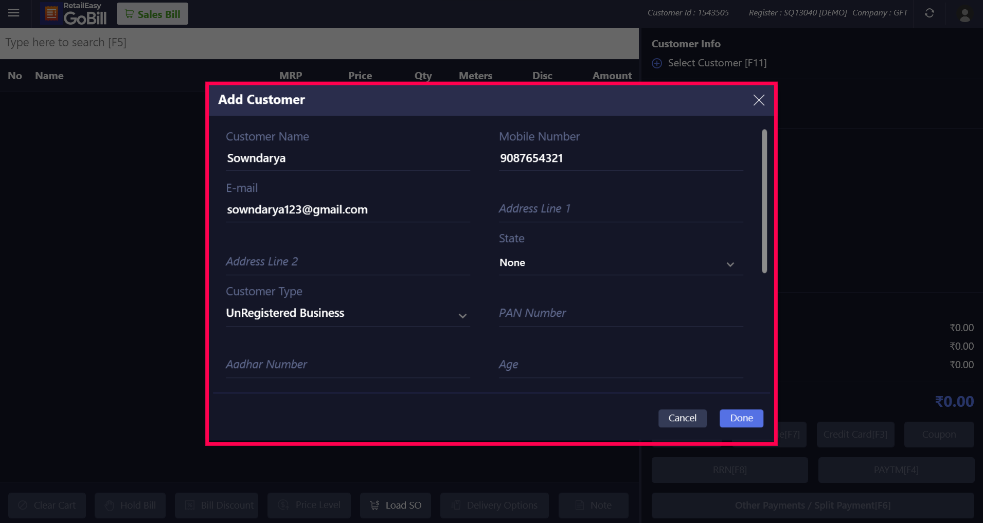 We can create bills in GoBill windows with or without customers. However, adding customers is required for specific functionalities such as delivery bills, due bills, RRN, and so on. In GoBill windows, you can either select customers who were added in the POS server (RPOS/RetailEasy) or create new customers directly from the GoBill windows' Sales Bill screen.
