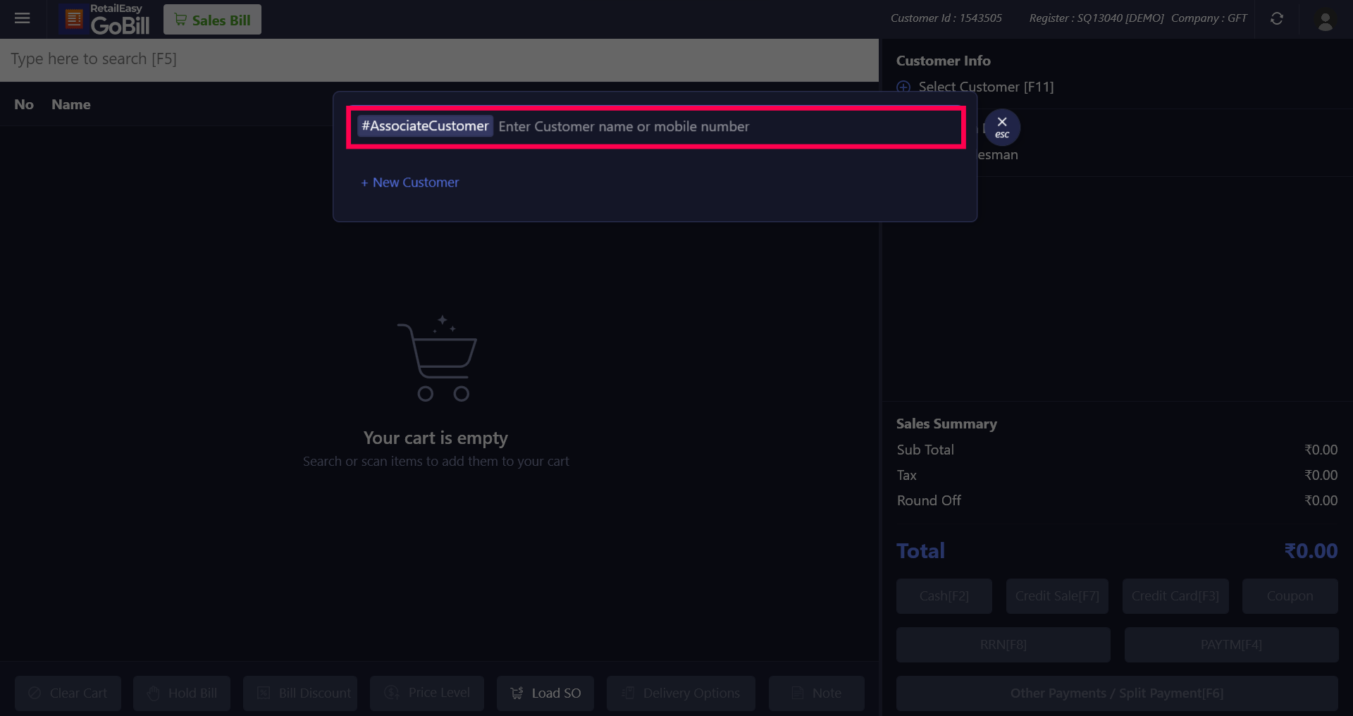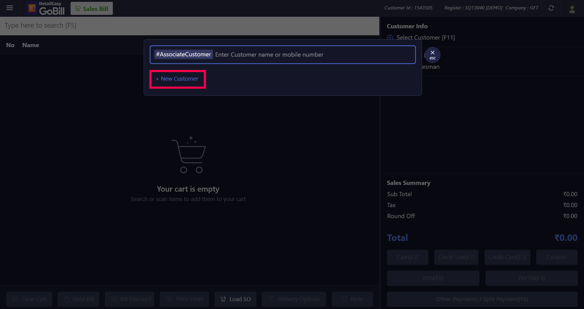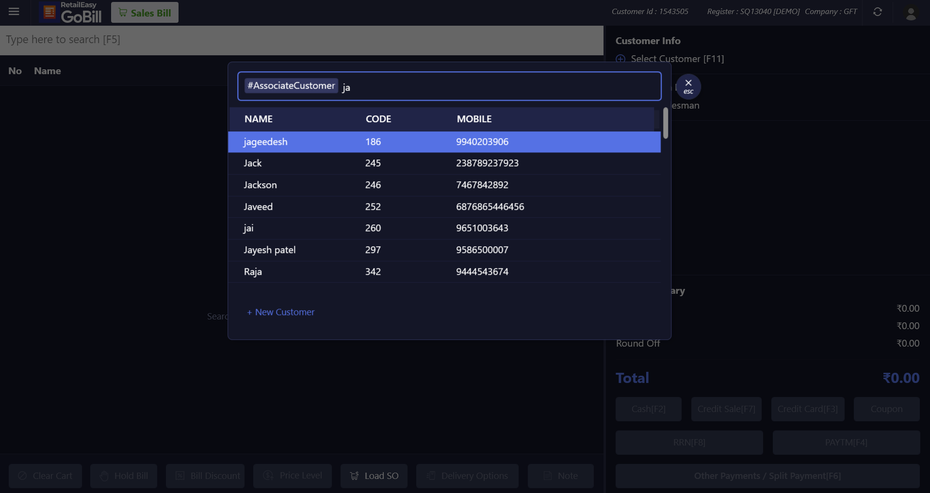 Step 2: To select/add the customer, enter the customer's name or mobile number into the search bar