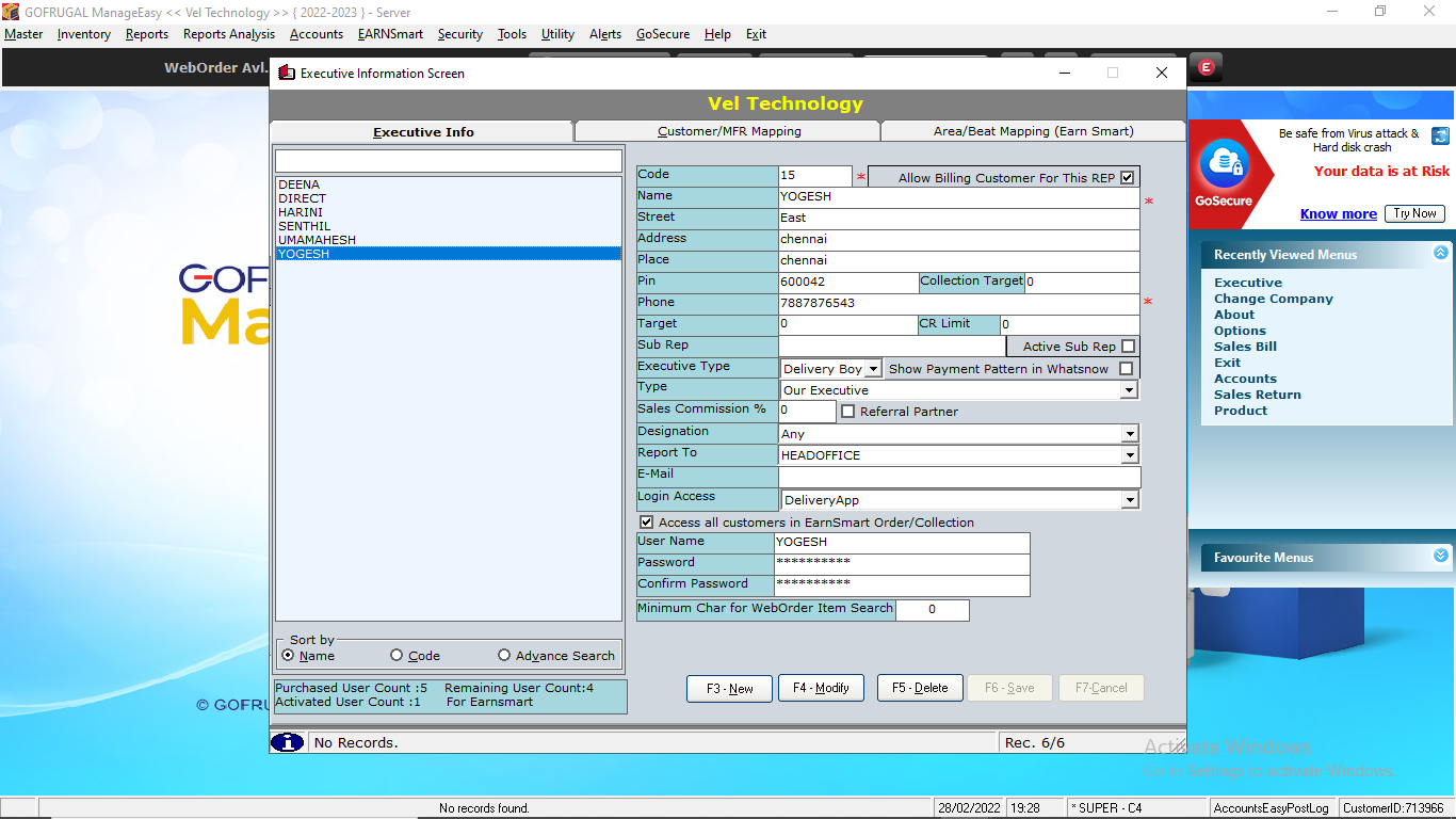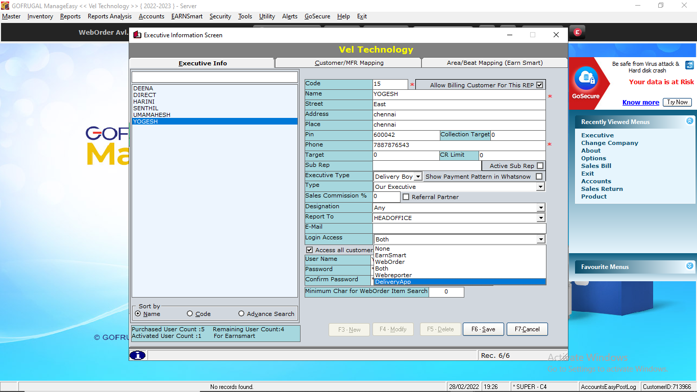 3. Select the executive type as "Delivery boy" and provide access to "Delivery app" in the login access