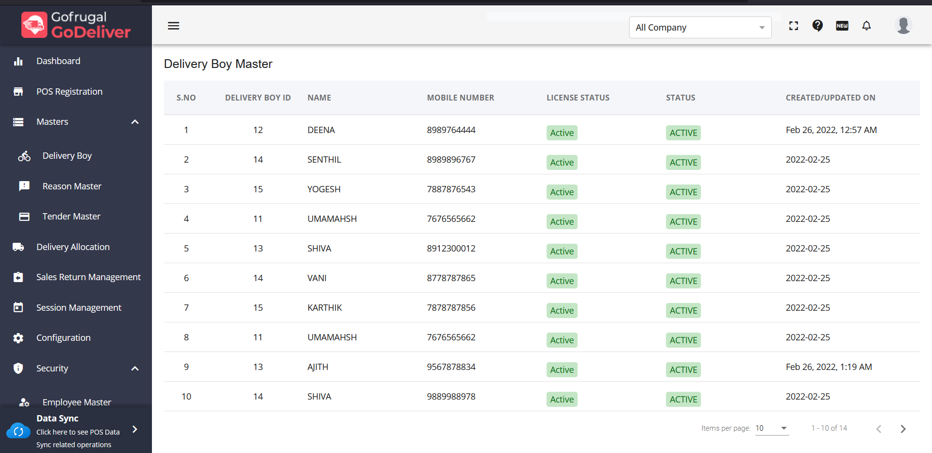 3. Now click on sync and once the synchronization is completed all the mapped delivery boys will be displayed in the integration portal. The delivery boys can also be filtered from the drop down in top corner based on the company and outlet.
