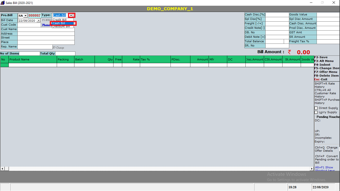 2. Select the type as Cash bill if your customer is paying the amount before the delivery using drop down symbol and click on enter (or) select credit bill