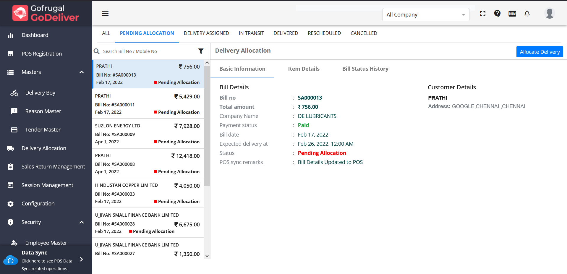 Click on Delivery allocation to view the bills that are yet to be assigned to the delivery boys under "Pending Allocation". Select the delivery bill that has to be assigned to the delivery boy and click on "Allocate Delivery". Also filter the bills based on company and outlets using the dropdown in the top right corner.