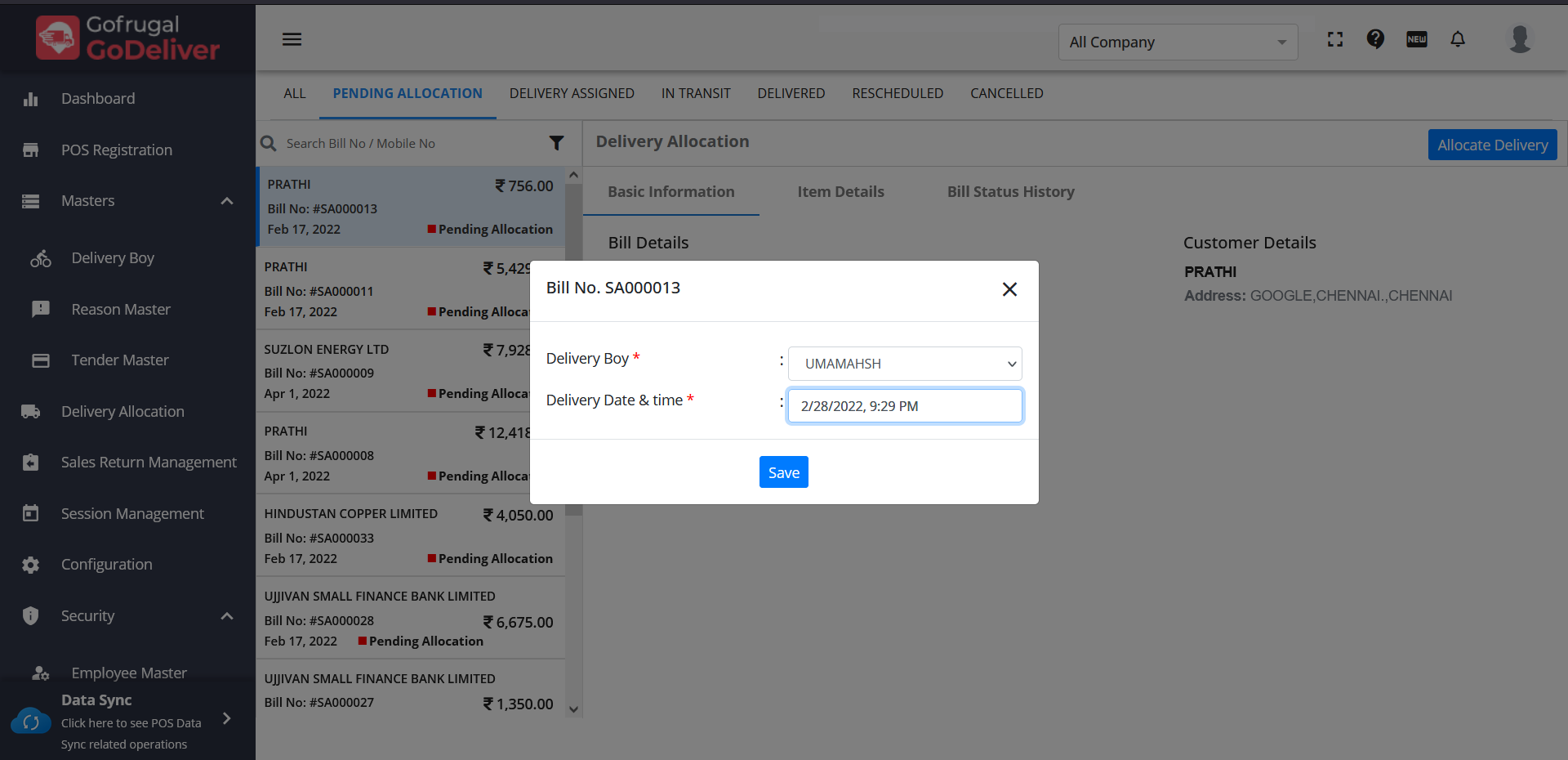 8. Select the delivery boy who is going to deliver that bill from your store to the customer's door's with the delivery date and time. Once the allocation is saved the delivery bill will be reflected in the delivery boy's GoDeliver app.