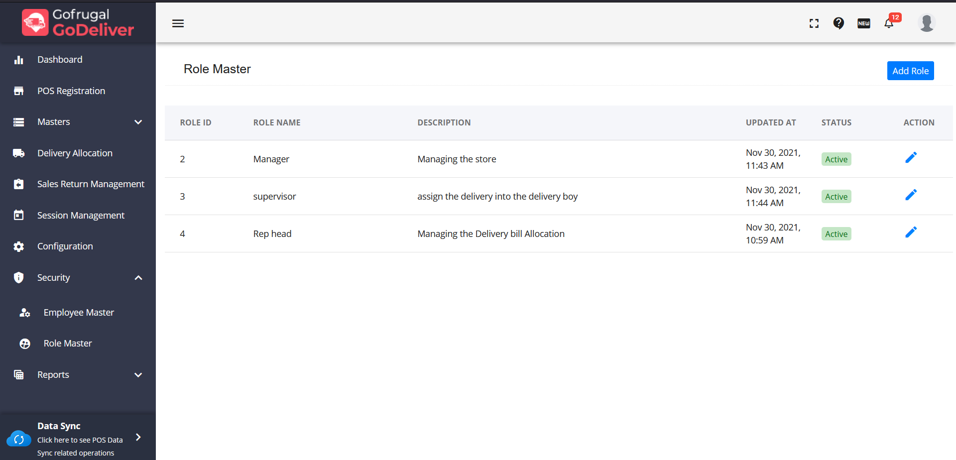 Then navigate to the role master screen where you can create the role by tapping on the ‘Add Role’ menu button.