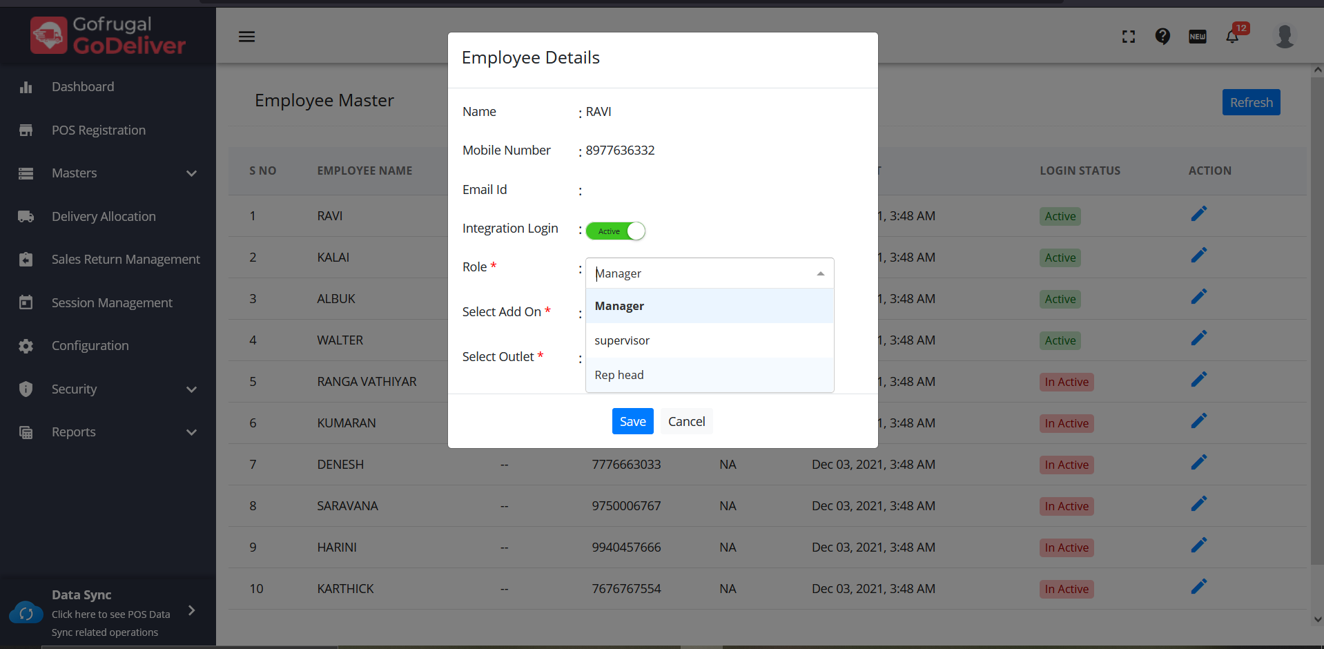 Assign the role which was created on the role master page. Update all the other details such as role, addon, and outlet details from the drop-down menu.