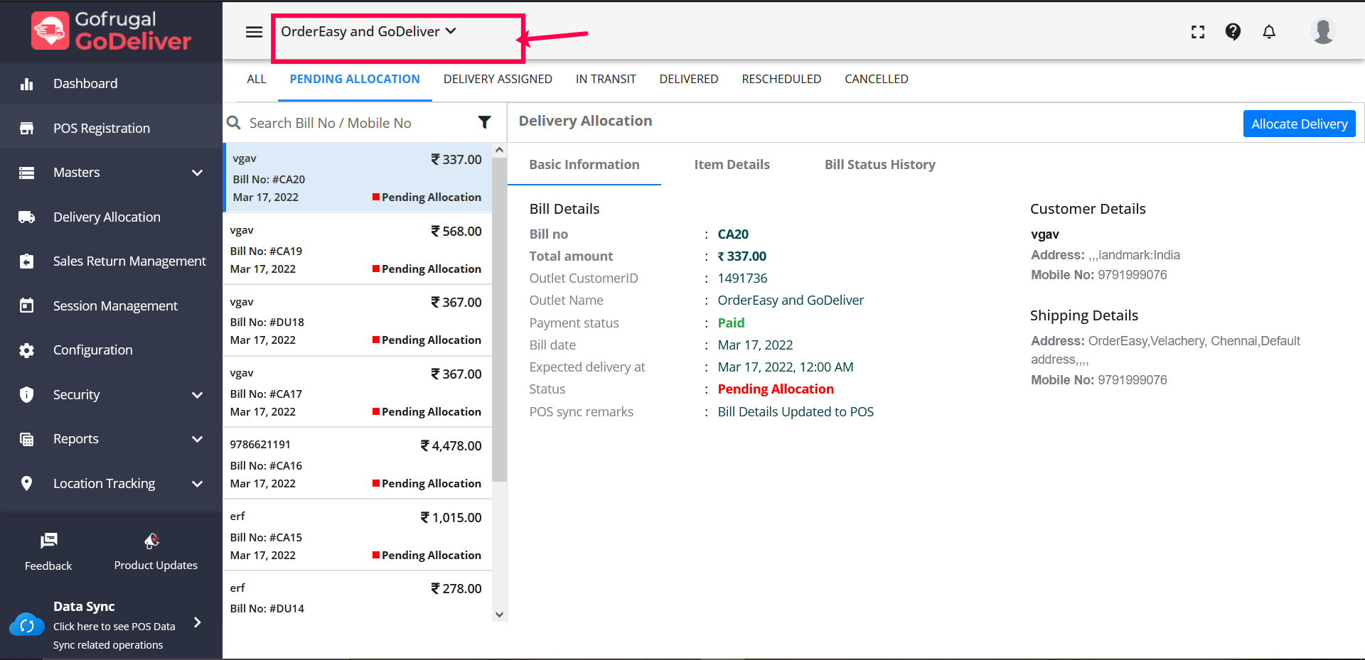 After the sync process is done, you can see the delivery bills of that outlet under "Delivery Allocation" and can also switch to other outlets using the drop down near the outlet name.