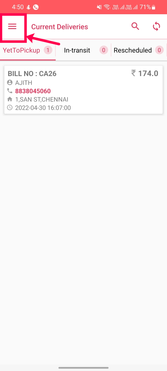 2. Once your delivery boy logs in, the delivery boy has to click on the menu option in the left corner.
