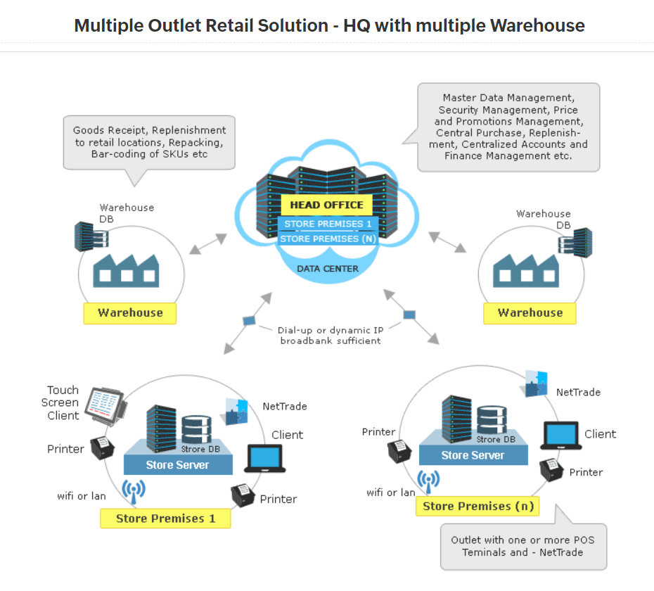HQ with multiple warehouses: This system is used by businesses with multiple warehouses to manage purchases and store operations. The head office can centrally manage master data, purchases, and promotions, allowing for complete control over store operations. Data backups are transferred to the head office through NetTrade.