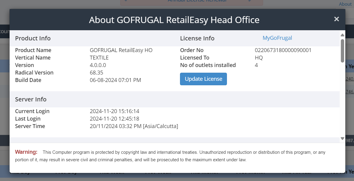 This information is from a GoFrugal RetailEasy HO software system. It details the software version (4.0.0.0, Radical Version 68.35, built on 06-08-2024), the license holder (MyGoFrugal), order number (0XXXXX6731800000XXXXX), license (HQ), and the number of installed outlets (4). Additionally, it shows recent server activity, including the current and last login times (15:16:14 and 12:45:18 on 2024-11-20) and the current server time (03:18 PM [Asia/Calcutta] on 20/11/2024).